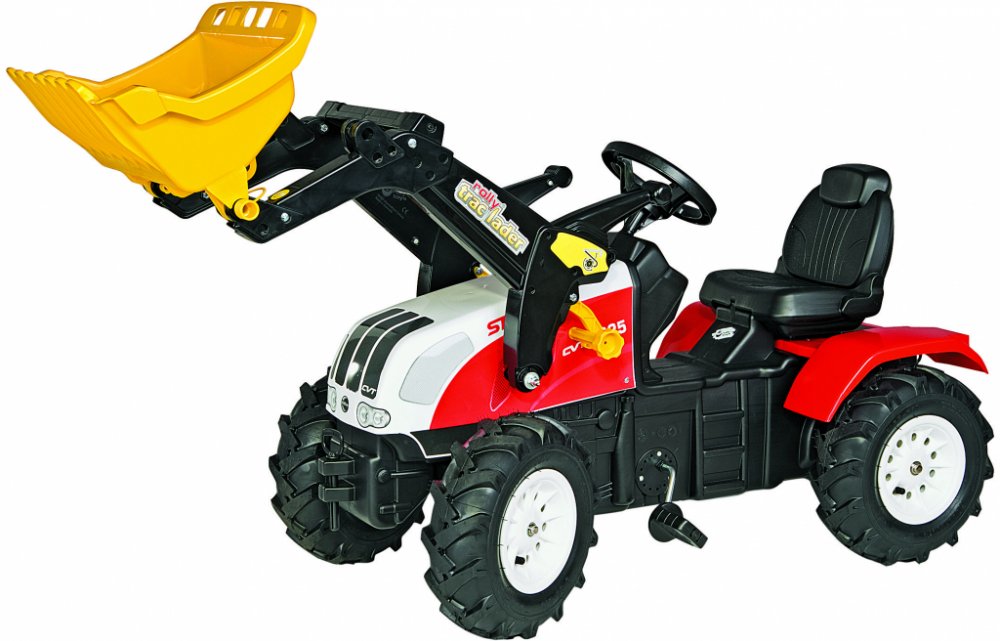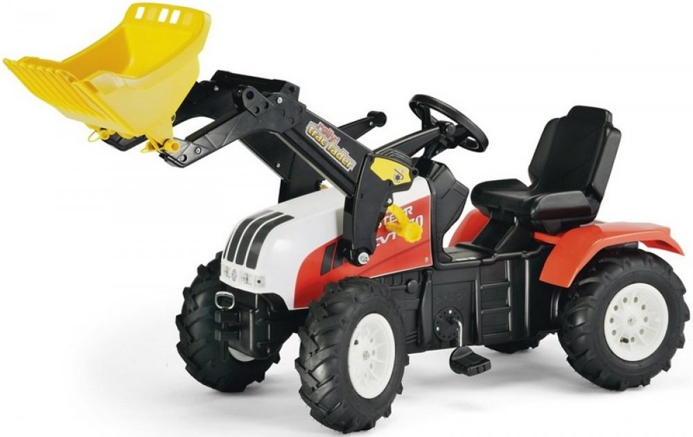 Dětský šlapací traktor s funkčním mechanickým čelním nakladačem
