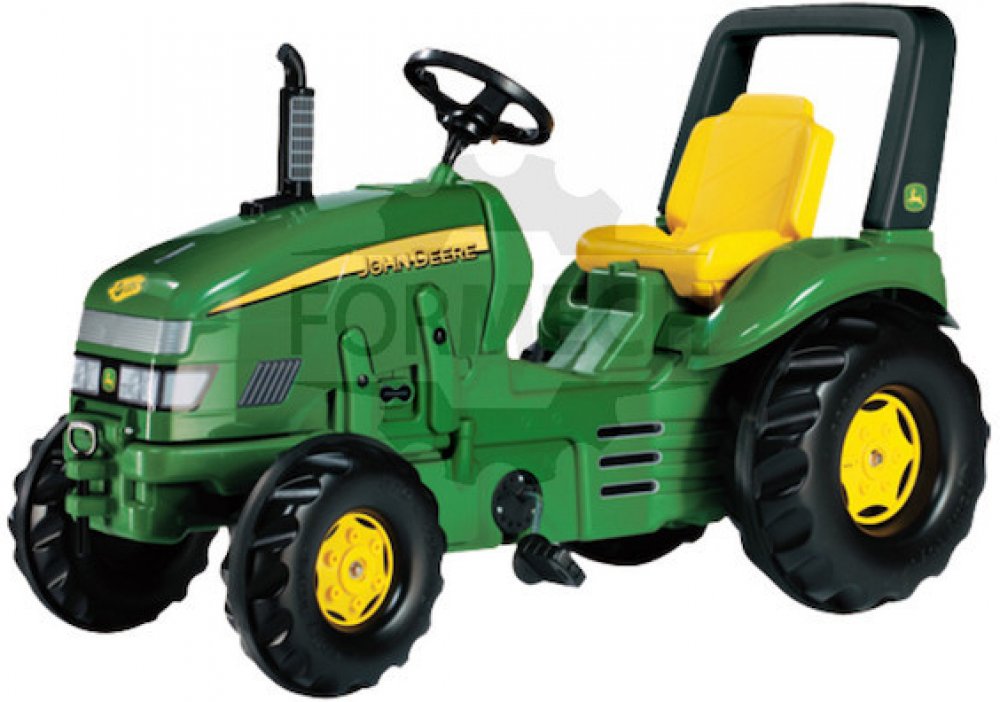 Šlapací traktor John Deere je vyroben z vysoce kvalitního plastu, který je snadno udržovatelný. Jedná se o licenční výrobek. Traktor má plně funční čelní nakladač. Součástí je i přívěs, který je možné odpojit. Lze otevřít kapotu motoru a přední náprava je plně funkční.