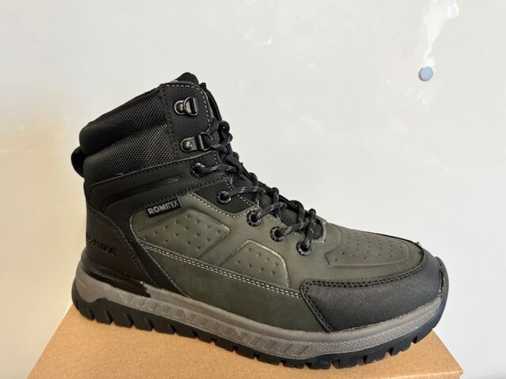 Pánské kotníkové boty Romika s TEX membránou proti promočení. Obuv je zateplena. Podešev obuvi je vyrobená ze syntetického materiálu. . Svršek obuvi je vyrobený ze syntetiky. Barva svršku je černo-šedá. Podšívka je vyrobená z textilního materiálu se zateplením. Stélka je vyrobená z textilního materiálu.