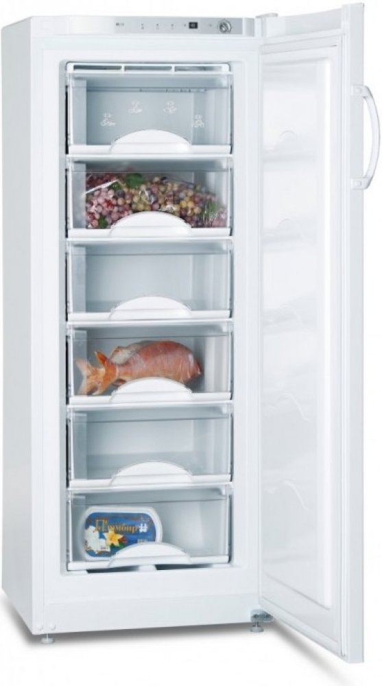 Volně stojící mraznička; bílé provedení; hrubý objem mrazničky 198 l; čistý objem mrazničky 184 l; hlučnost 39 dB; energetická třída E; elektronické řízení teploty s mechanickým ovládáním; funkce super mrazení; roční spotřeba el. energie 196 kWh; klimatická třída SN-T; mrazící výkon 24 kg / 24 h; výdrž bez proudu 16 h; 6 celoplastových výsuvných boxů; možnost změny směru otevírání dveří; rozměry (...