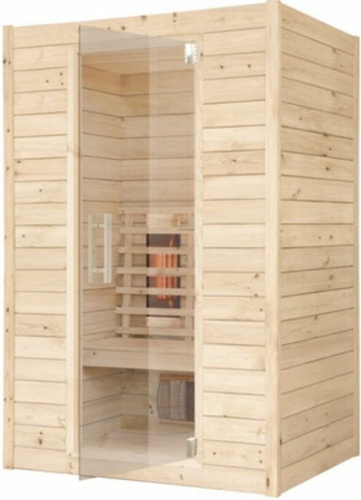 - sauna je vyrobená ze širších vodorovných dřevěných palubek se skleněnými jednokřídlými dveřmi