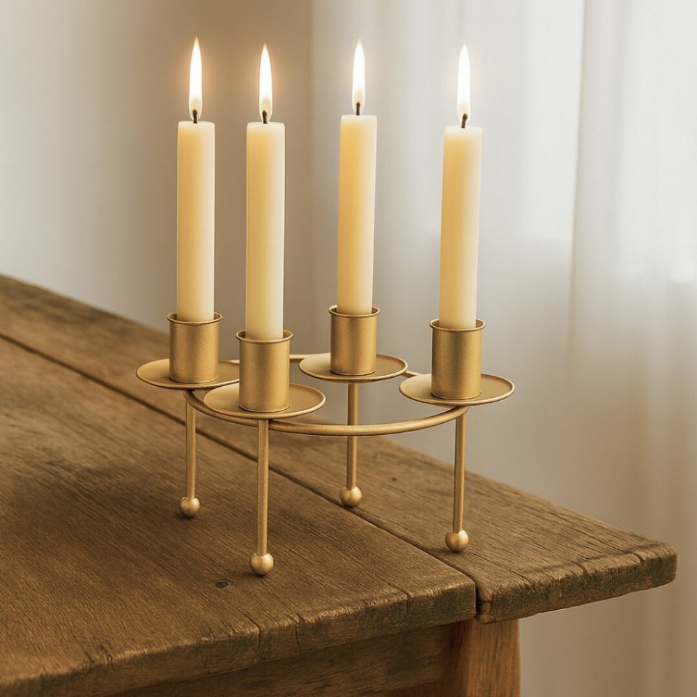 - Jeho čistý kruhový tvar, čtyři stabilní nožičky zakončené kulatými detaily a držáky na kónické svíčky vytvářejí elegantní a zároveň minimalistický vzhled. Otvor pro svíčku 2-2,2 cm
