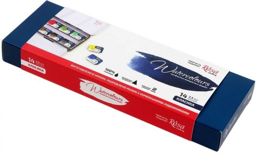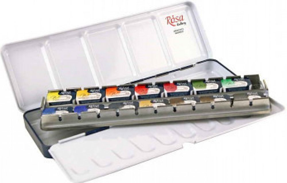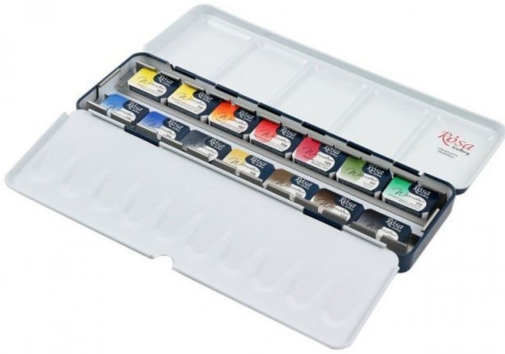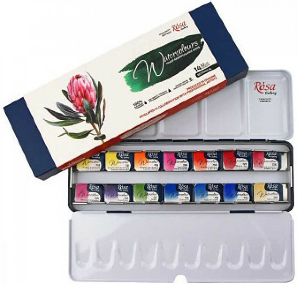 Sada akvarelových barev Rosa Gallery Fine Art Classic obsahuje 14 odstínů barev, které jsou vyrobeny z arabské gumy a prémiových jemně mletých organických a anorganických pigmentů.Organická arabská guma poskytuje dokonalou přilnavost a rovnoměrný barevný tok. Vysoce kvalitní organické a anorganické pigmenty zaručují čistotu a transparentnost každé barvy. Vysoká koncentrace pigmentu dodává umělcům širokou škálu barev od průhledné až po plně neprůhlednou. Přirozené schnutí zajišťuje snadné ředění. Barvy jsou vysoce světlostálé a mají jasné a živé barvy. Kombinujte tradiční barvy pro akvarelové techniky. Většina barev v sortimentu sady je monopigmentová, což umožňuje při míchání vytvářet čisté odstíny. Většina barev, které tvoří jediný pigment, vám umožní získat četné úžasné čisté odstíny, když se barvy smíchají.