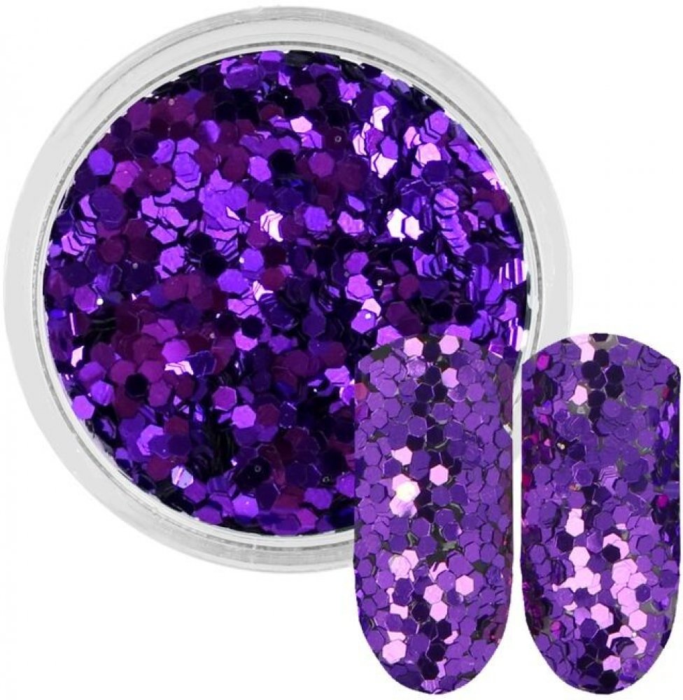 Lesklé tmavě fialové třpytky ve tvaru medového plastu. Vhodné do gelu, polygelu akrylu i do gel laku. Můžete je použít i na lakované nehty. Třpytky vkládejte do nezaschlé vrstvy. Zaschnutím se pak pevně uchytí a zdobení postačí zafixovat průhlednou vrstvou. Můžete je také vmíchat přímo do materiálu, nebo použít k jinému kreativnímu tvoření a zdobení různých předmětů a povrchů. Baleno v 3ml plastové nádobce.
