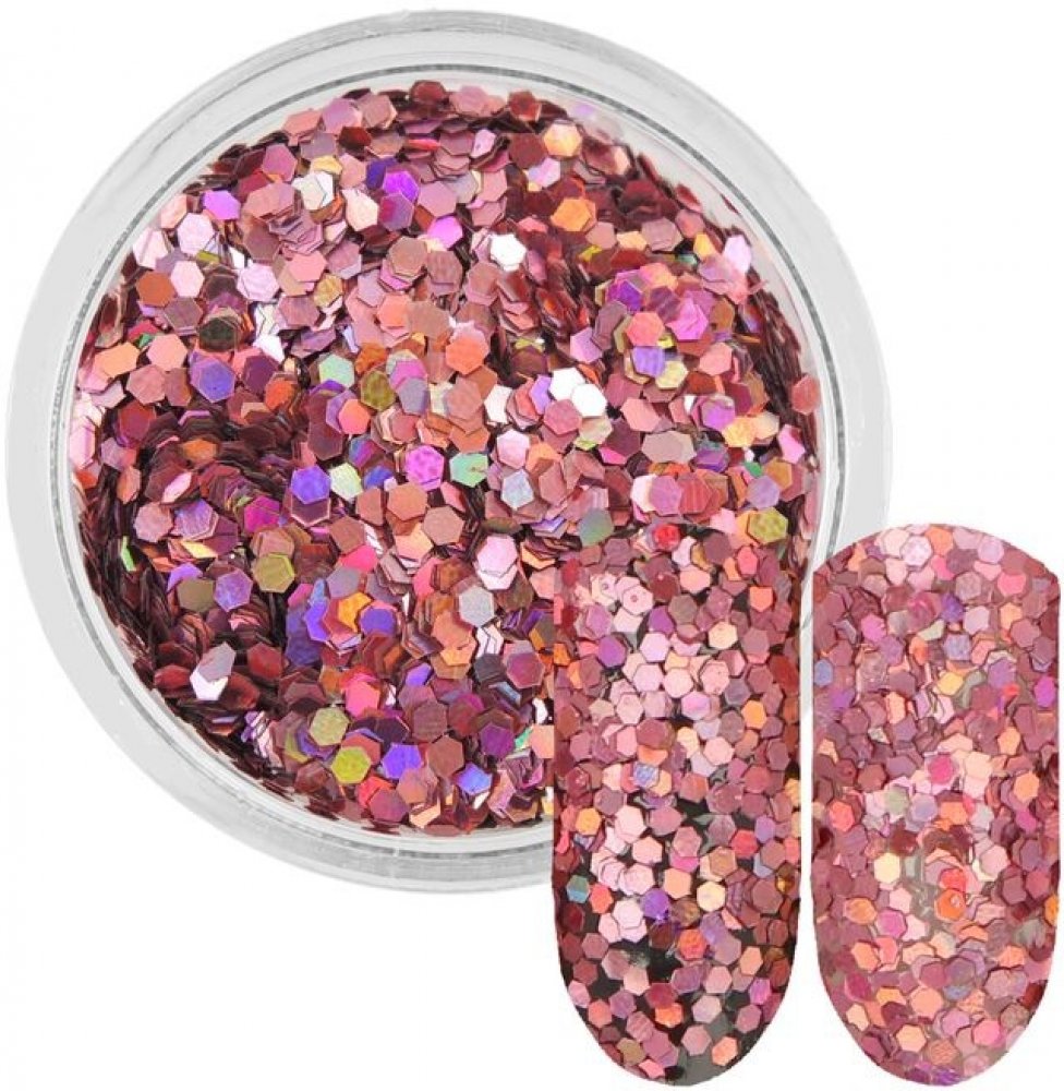 Světle růžové glitry na nehty. Třpytky ve tvaru včelího plástve se krásně lesknou, a tak oživí nudné jednobarevné nehty, nebo francouzskou manikúru. Vhodné pro zdobení nehtů, nebo i pro jiné kreativní využití. Můžete je použít s gelem, polygelem is akrylem. Objem 3ml.