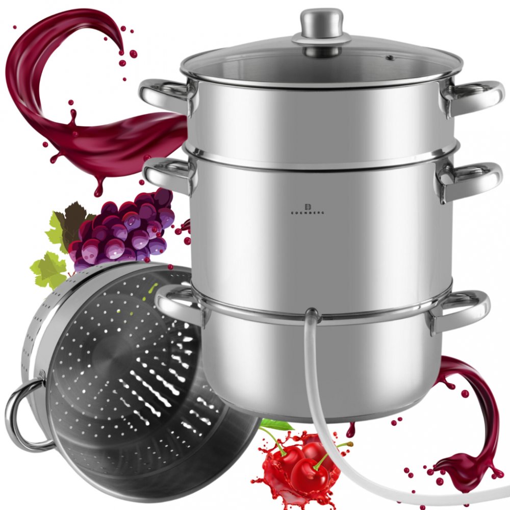 Rossler Odšťavňovací hrnec 8l TW23, nerez, indukce - Hrnec se skládá ze skleněné poklice s otvorem pro únik páry, perforovaný hrnec na ovoce, sběrný hrnec na šťávu s vypouštěcí hadičkou, hrnec na vodu se sendvičovým dnem. Hrnec je vhodný na všechny typy sporáků včetně indukce.