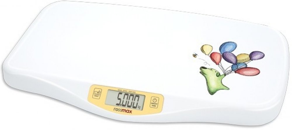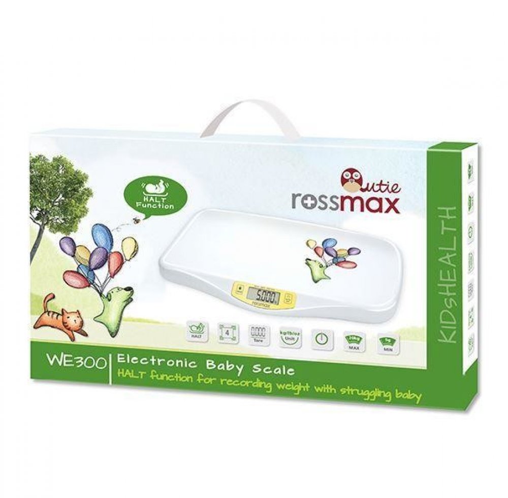 Kojenecká a dětská váha Rossmax WE300 je určena předevší do domácností. Měřící rozsah je v rozmezí od 100 g do 20 kg, proto vyhovuje pro děti od narození do cca 5 let věku. Váha se zapne hlavním ovládacím tlačítkem 0/I, jakmile na displeji naskočí hodnota „0000“, tak je váha připravena k vážení. Po položení dítěte se zobrazí hmotnost dítěte. Váha je vybavena také funkcí HOLD pro vážení neklidných dětí. Tato funkce je aktivní pro každé běžné měření. V případě zvlášť neklidného dítěte je možné zvolit tuto funkci i ručně, měření poté trvá cca 20 sekund. Funkce TARE slouží pro nulování váhy v případě použití podkladových plen, osušek apod.