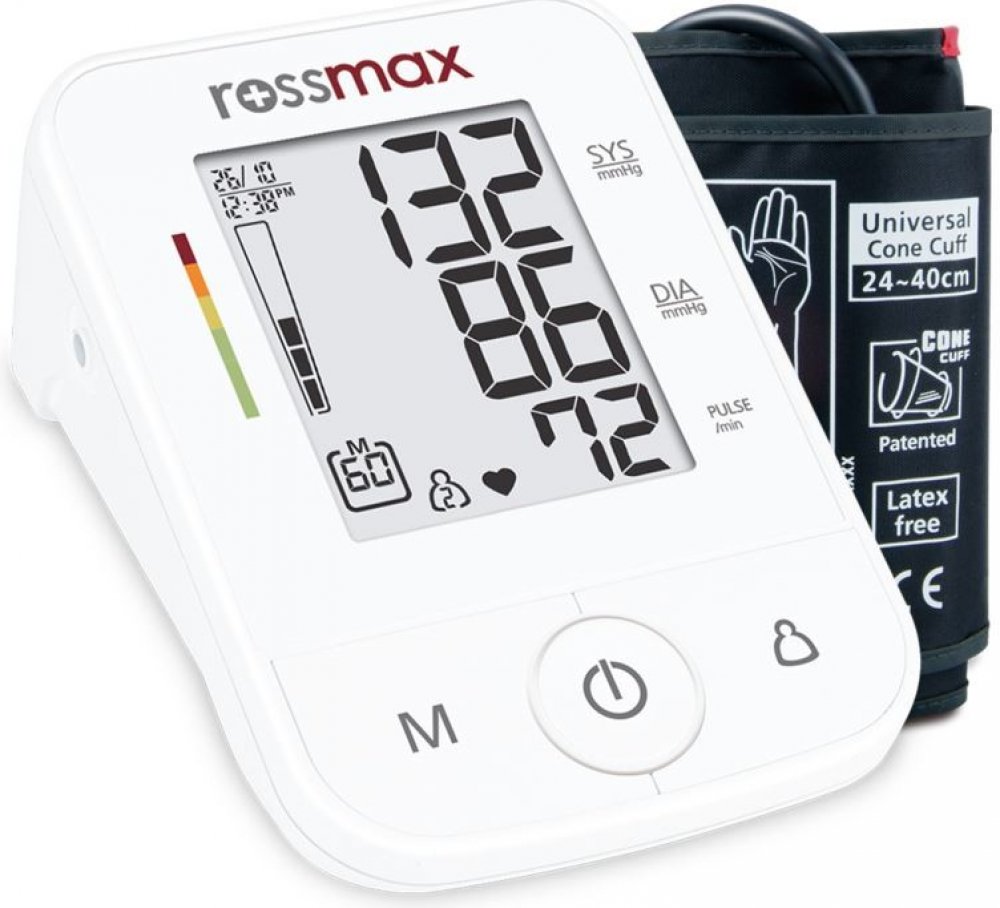 Rossmax bílé kombinované 120 měření na paži pažní s flexibilním napájením (baterie + adaptér) klinicky validované pro páry (2 profily) oscilometrické automatické 24 - 40 cm kónická 30 - 260 mmHg 40 - 199 tep/min 240 g 140 x 63 x 94 mm pouze lokální paměť