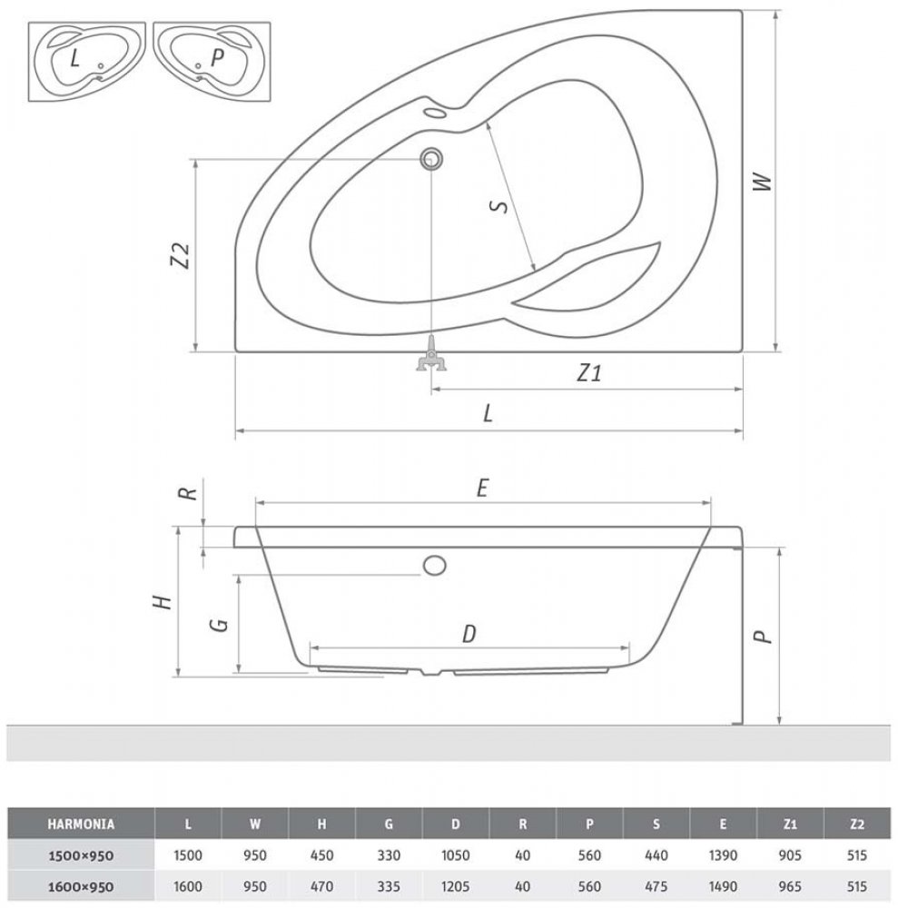 Půdorys levého a pravého provedení vany HARMONIANejvětší výhodou asymetrické vany je, že si i v menší koupelně můžete dopřát maximum luxusního odpočinku. Výhodou je odtok, prakticky umístěň uprostřed vany, který vás při koupeli netlačí.