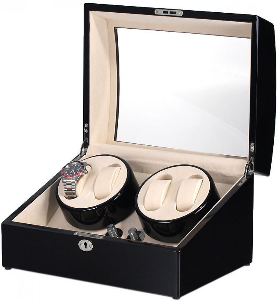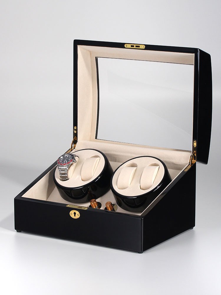 Krásný designový natahovač hodinek na 4 hodinky s extra tichými motory a 4 programy na výběr. Do natahovače můžete také uložit až 5 dalších hodinek. Pouzdro je kvalitně zpracované a pokryté černým lesklým lakem. Vnitřek je vystlán světlým sametem. Držáky hodin mají obvod cca. 15-19 cm. U malých hodinek lze polštářek zmenšit odstraněním pásku. Připoutané hodiny (zejména kovové páskové) by neměly přesáhnout obvod 19 cm, jinak by mohly být příliš volné a při otáčení vypadnout.