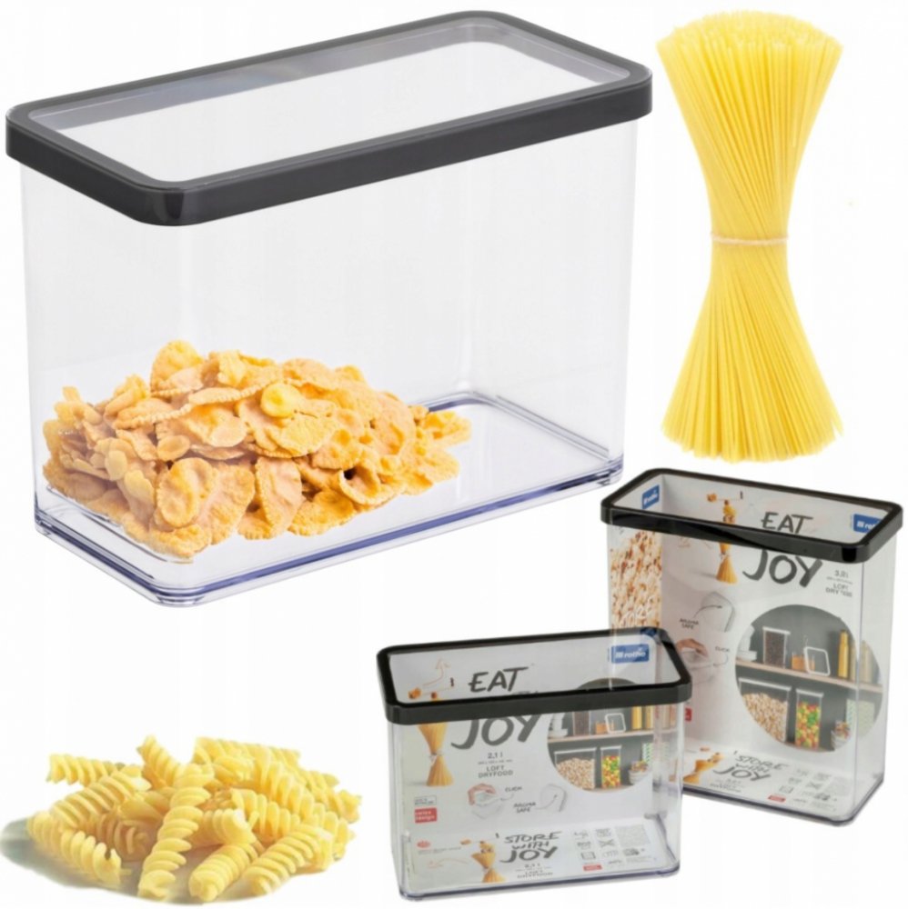 Ideální pro skladování: těstovin, mouky, krupice, rýže, kávy, oříšků a sušených ovocí, cereálií a dalších sypkých produktů. Tenký tvar umožňuje pohodlné umístění nádoby do skříněk, spíže nebo ledničky.