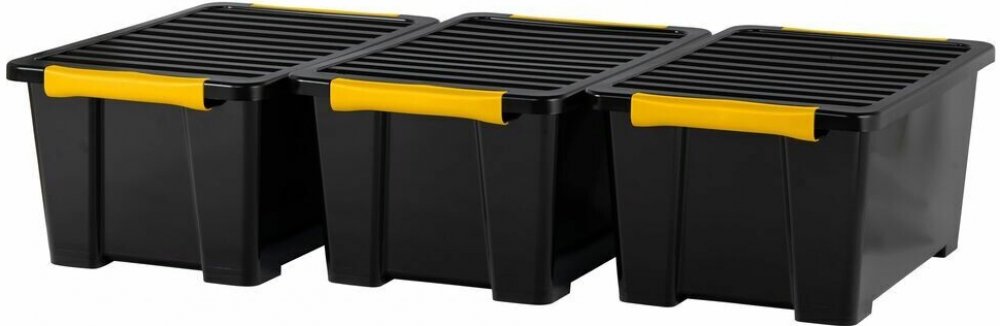 Sada 3 úložných plastových boxů s víkem. Každý box má objem 44L. Moderní design a kvalitní provedení od švýcarské značky Rotho. Lesklá černá barva. Víka jsou opatřena žlutými postranními úchyty pro bezpečné zaklapnutí. Boxy lze snadno stohovat na sebe - ideální řešení pro přehledné a úsporné skladování. |