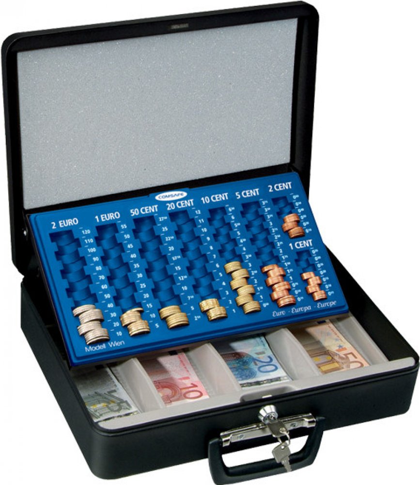 Objevte přednosti europokladničky, které v sobě spojuje výhody klasické europokladničky a kompaktního kufříku. Uschovejte menší obnos peněz v pokladničce, která se po zavření může používat i jako kufřík. Po otevření europokladničky se automaticky vysune spolu s věkem i plastový mincovník. Disponuje 8 radami pro euromince, od 1 centových až po 2 eurové. Pod mincovníkem se skrývají 4 plastové přihrádky pro eurobankovky. Po zavření víka můžete europokladničku přenášet buď jako kufřík nebo klasicky jako pokladničku za pomoci horní rukojeti.