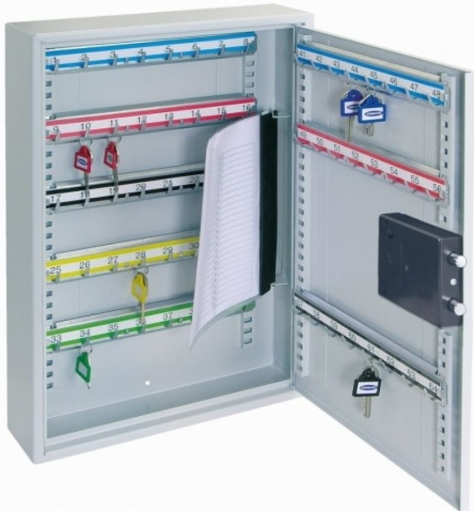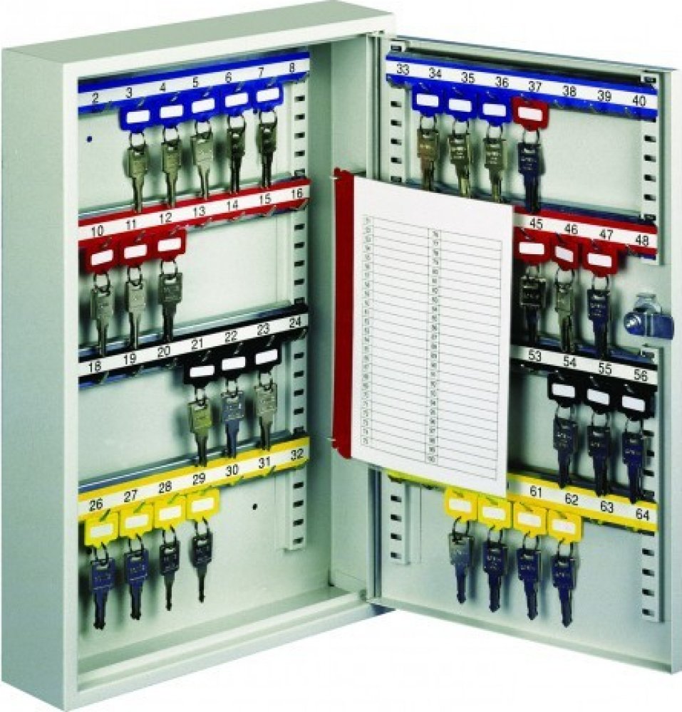 Skříňka na klíče S64 EL je vyrobena z vysoce kvalitního ocelového plechu a je uzpůsobená pro upevnění na stěnu dvěma otvory v zadní stěně skříňky. Skříňka S64 EL má háčky na klíče číselně a barevně rozlišené, háčky jsou pozinkované. Lištu s háčky je možné výškově umístit dle potřeby.