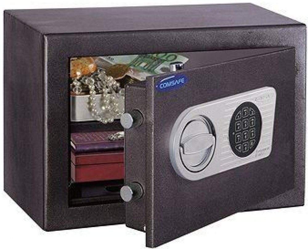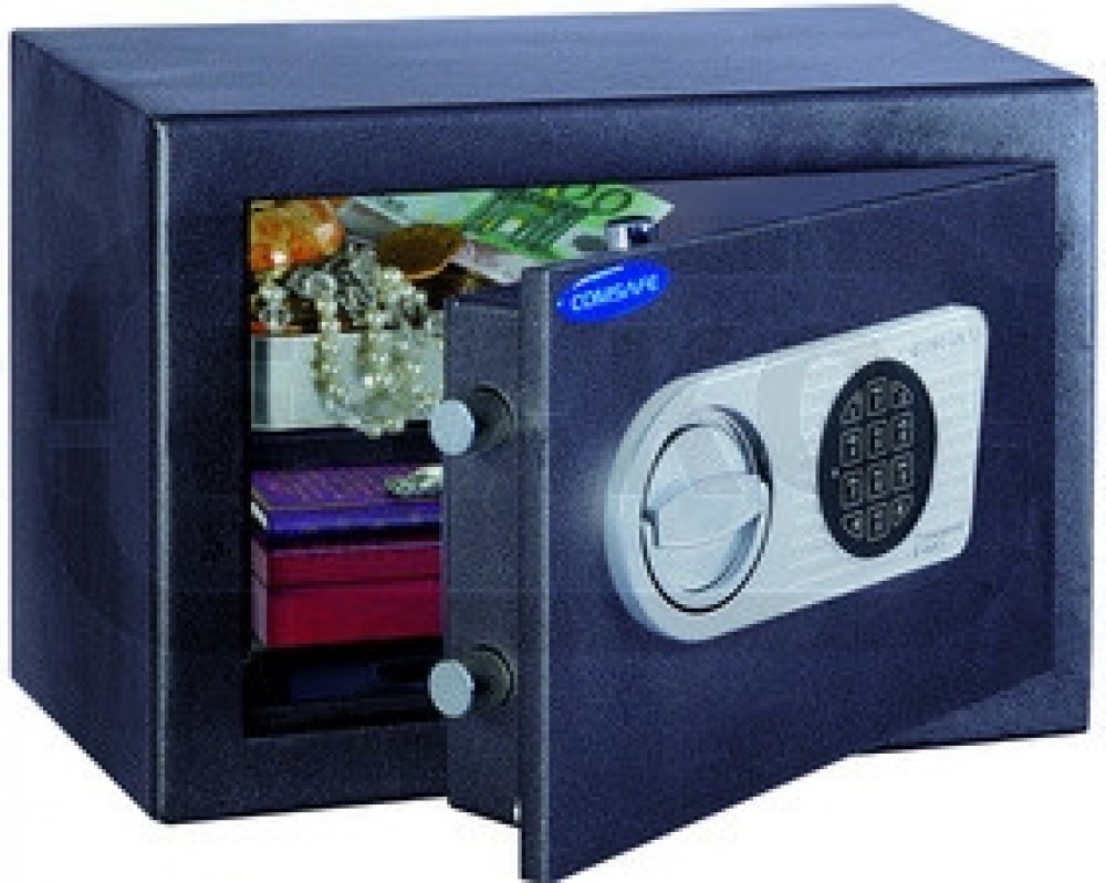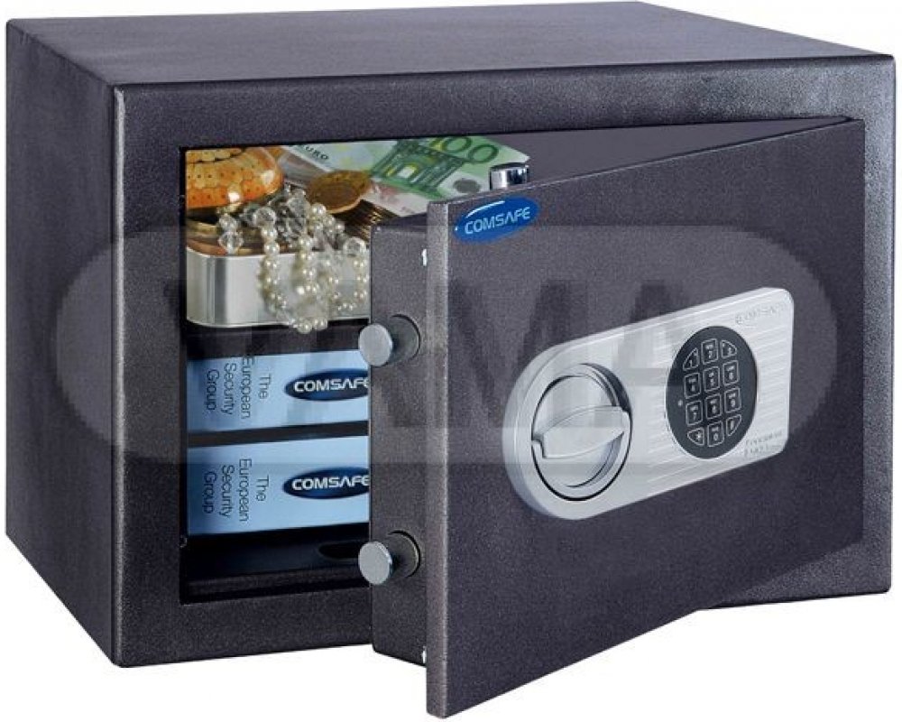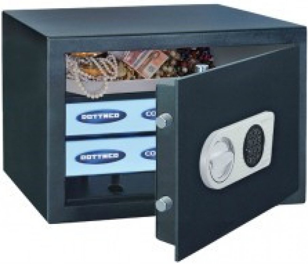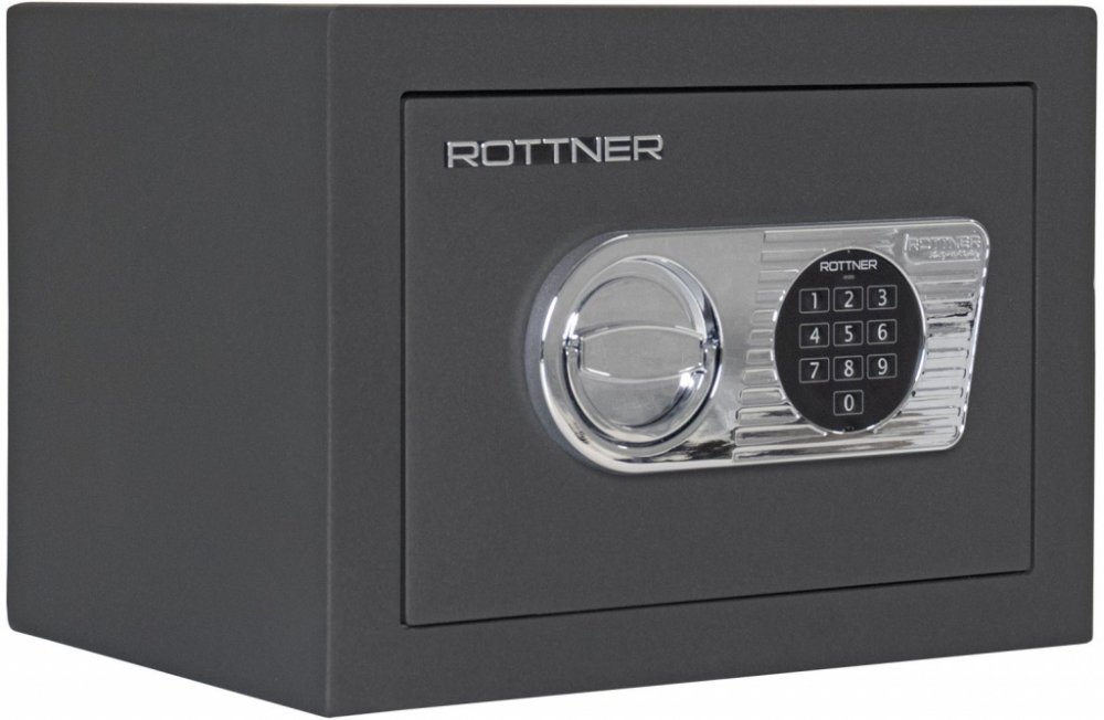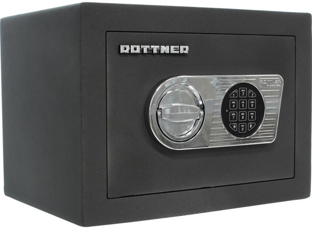 Vnější plášť 3mm a vnitřní 2mm ocel.Čelní ocelová deska dveří 12mm s třístranným rozvorovým zámkem s průměrem zamykacích čepů 25mm. Pro ukotvení trezoru jsou vždy 2 otvory v podlaze a 2 v zadní stěně. Barva černá. Bezpečnostní trezorový zámek dle normy VDS 1 s pancéřováním z manganové kalené oceli. Tento elektronický zámek disponuje možností nastavení časového zpoždění otevření trezoru až o 90 min...