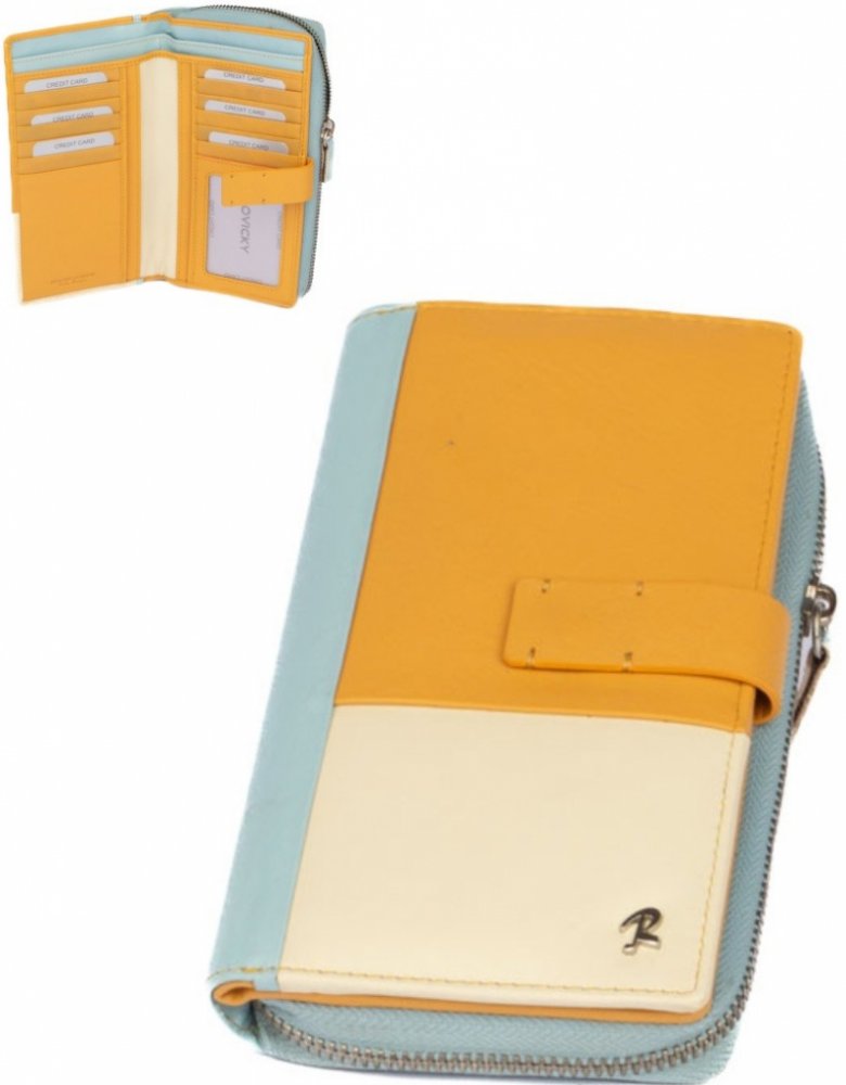 Peněženka barevná dámská v barevné kombinaci světle modré a béžové barvy je vyrobená z měkoučké pravé kůže. Peněženka má v jedné polovině jednu velkou kapsu na zip, která je přístupná bez nutnosti otevřít peněženku. Kapsa je dělená na tři kapsy. Do jedné velké kapsy lze dát i mobil velikosti cca 15,5 x 7,5 cm. Další kapsu, tenkou na zip, lze využít jako mincovník na pár mincí. Druhá polovina peněž...