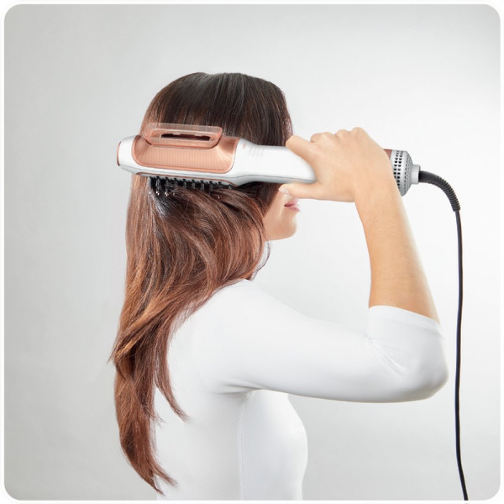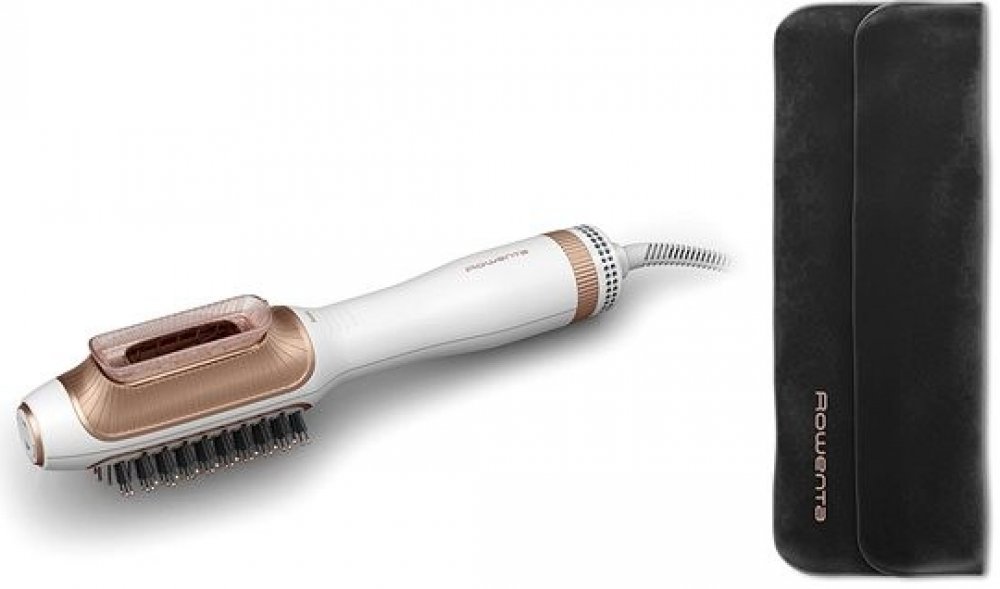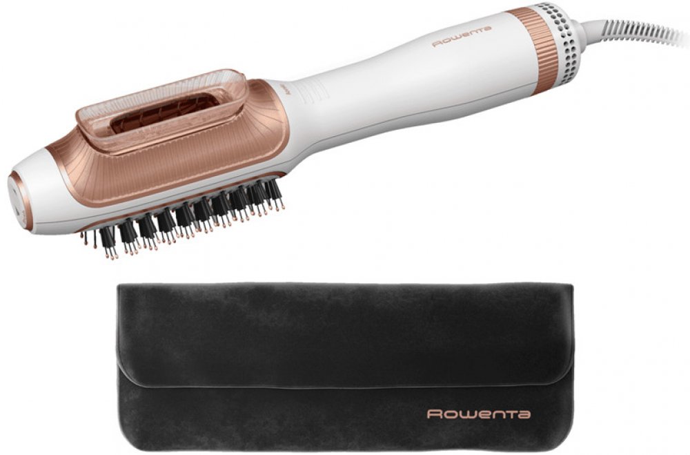 elektrický kartáč na vlasy 2v1 (vysoušeč vlasů a horkovzdušný kartáč), pro předvysoušení a vysoušení, funkce Reverse přepíná z vysoušeče vlasů na horkovzdušný kartáč, až 2x větší objem a 2x více lesku, funkce Care s mírným teplem, 2 nastavení rychlosti/teploty, balení obsahuje cestovní pouzdro, barva bílá a zlatá růžová, 15ti letá záruka opravitelnosti (CF9820F0)
