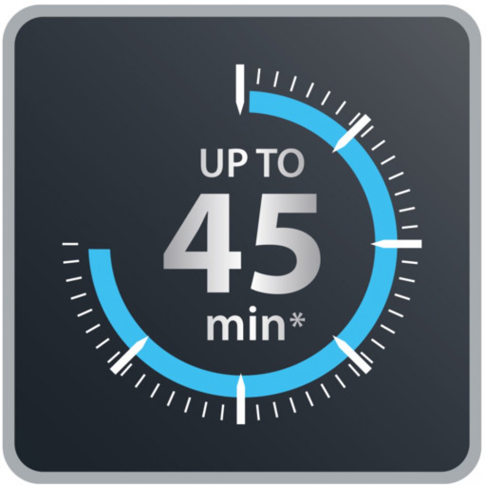Doba provozu až 45 minut* je ideální jak pro zběžný úklid na poslední chvíli, tak pro dlouhý a důkladný úklid
