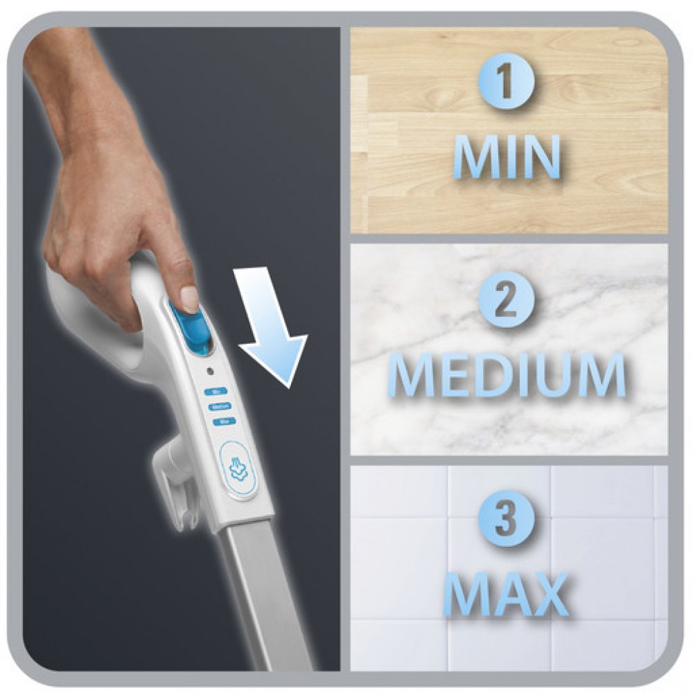Na ergonomickém držadle regulujete množství páry. Na výběr máte ze 3 nastavení pro všechny typy tvrdých povrchů.