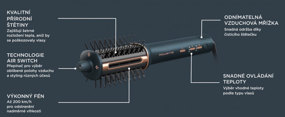 Select brand:ÚvodHlavní infoGalerieTechnické specifikaceKulmofén Air Brush 3D Rowenta UB9720E0Chcete si v pohodlí domova dopřát účes, jako byste právě opustili kadeřnický salon? Kulmofén Air Brush 3D Rowenta UB9720E0 vám to umožní. Air Brush 3D Rowenta v sobě spojuje výhody vysoušeče a kulmy, nabízí flexibilitu ve formě výměnných kartáčů, a tak vám umožní vytvořit účes přesně dle vašich představ mnohem rychleji a efektivněji, než byste čekali. Díky ergonomickému tvaru se pohodlně drží a snadno se s ní manipuluje. Kulmofén disponuje třemi rychlostmi foukání a třemi teplotními stupni. Nechybí jí ani tlačítko pro rychlé ochlazení vzduchu, napomáhající při závěrečné fixaci účesu. Jistě oceníte i její jednoduchou údržbu.Oválný kartáč nabízí proudění vzduchu pod úhlem 360°pro účinné sušení. Dodává maximální objem, nadýchaný vzhled. Lopatkový kartáč rozčesává a uhlazuje vlasy v horizontální poloze. Nabízí přirozeně elegantní vzhled narovnaných vlasů jako od profesionála. Přírodní štětiny umožňují jemný rozvod...