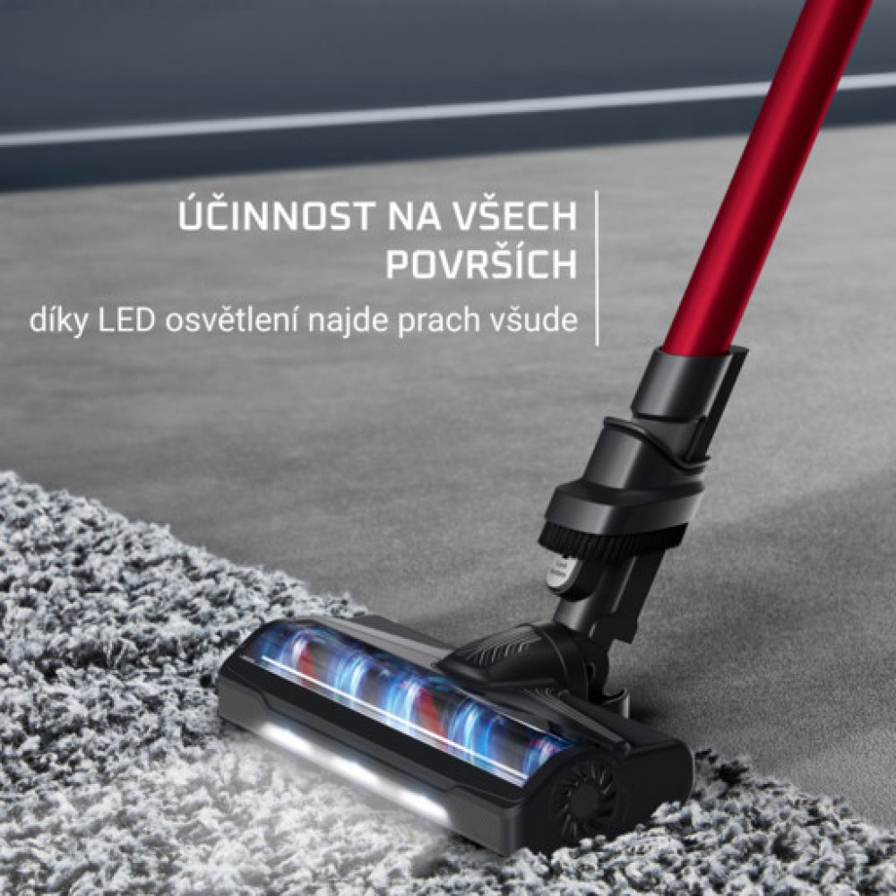 Vysoce výkonný sací kartáč zajišťuje vysoce účinný úklid na všech typech podlah, kobercích i běhounech a díky LED osvětlení najde prach všude.