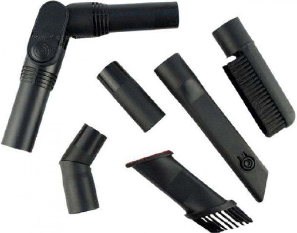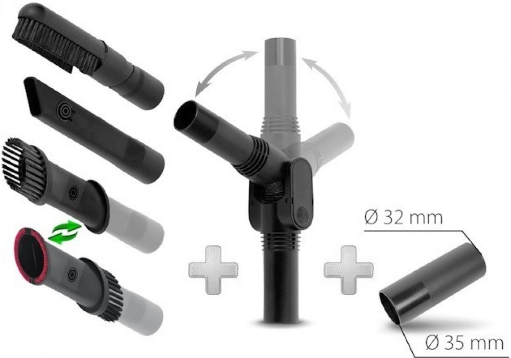 Multifunkční sada S adaptérem pro válcový vysavač Navržen pro snadnější vysávání v obtížně přístupných zónách a pro odstranění prachu ve všech situacích: - V domácnosti: nad nábytkem, za radiátory, v těsných koutech atd. - v autě: pod sedadly, v palubní přihrádce, mezi palubní deskou a čelním sklem atd. Díky adaptéru lze použít s většinou trubicových vysavačů 32–35 mm