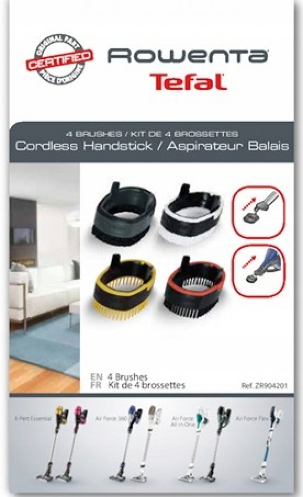 Sada 4 kartáčů ZR904201 EasyBrush obsahuje 1 jemný kartáč na jemné povrchy, 1 kartáč na textil pro oblečení, tkaniny a odstranění vlasů a prachu, 1 Intensive kartáč pro odstranění zanesených nečistot a 1 klasický kartáč pro tvrdé povrchy. Kartáče jsou kompatabilní s tyčovými vysavači Rowenta Air Force Flex 560 RH94xx, Air Force Flex 760 RH95xx, X-Pert Essential RH73xx a Air Force 360 RH90xx Klíčové vlastnosti Kompatabilní s tyčovými vysavači Rowenta Air Force Flex 560 RH94xx, Air Force Flex 760 RH95xx, X-Pert Essential RH73xx a Air Force 360 RH90xx Sada obsahuje 4 druhy kartáčů
