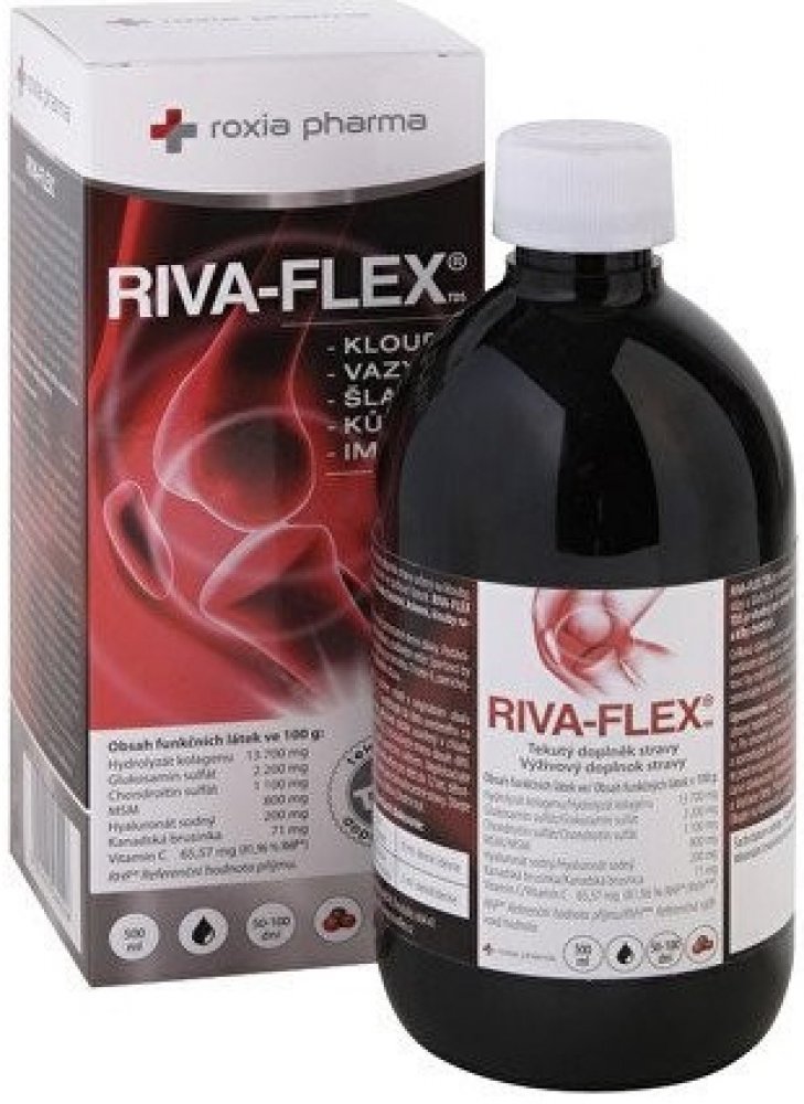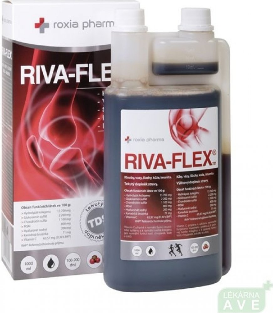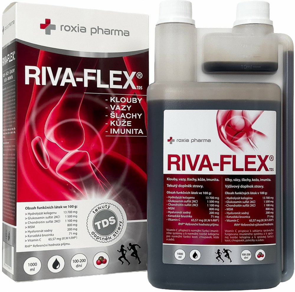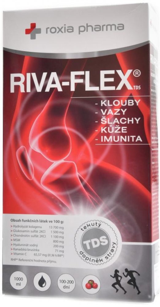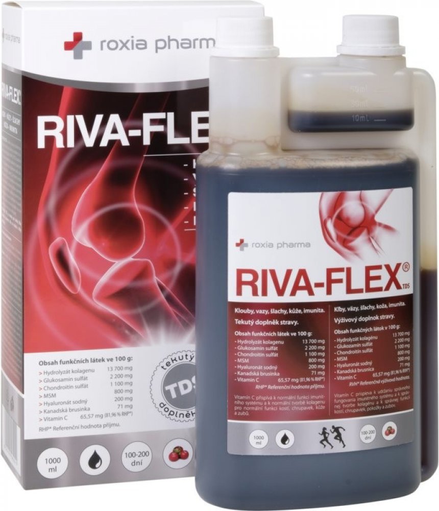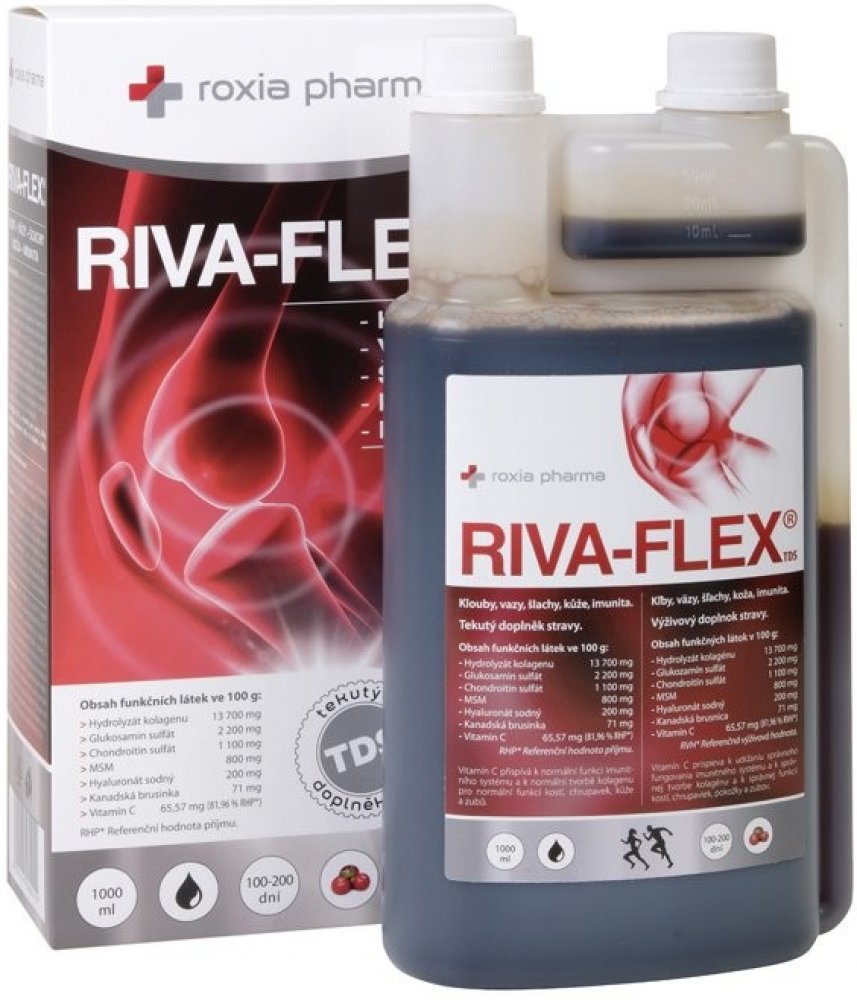 Roxio Pharma tekuté 1000 ml klouby, kosti, svaly unisex 100 g RIVA-FLEX pro dospělé perorální od 12 let brusinka Česká republika kolagen kosti a klouby 100 1670.6 mg Večer Iniciální dávka 10 ml denně (první 3 měsíce); udržovací dávka 5 ml den Suché místo + pokojová teplota, Chladné + suché + tmavé místo, Chránit