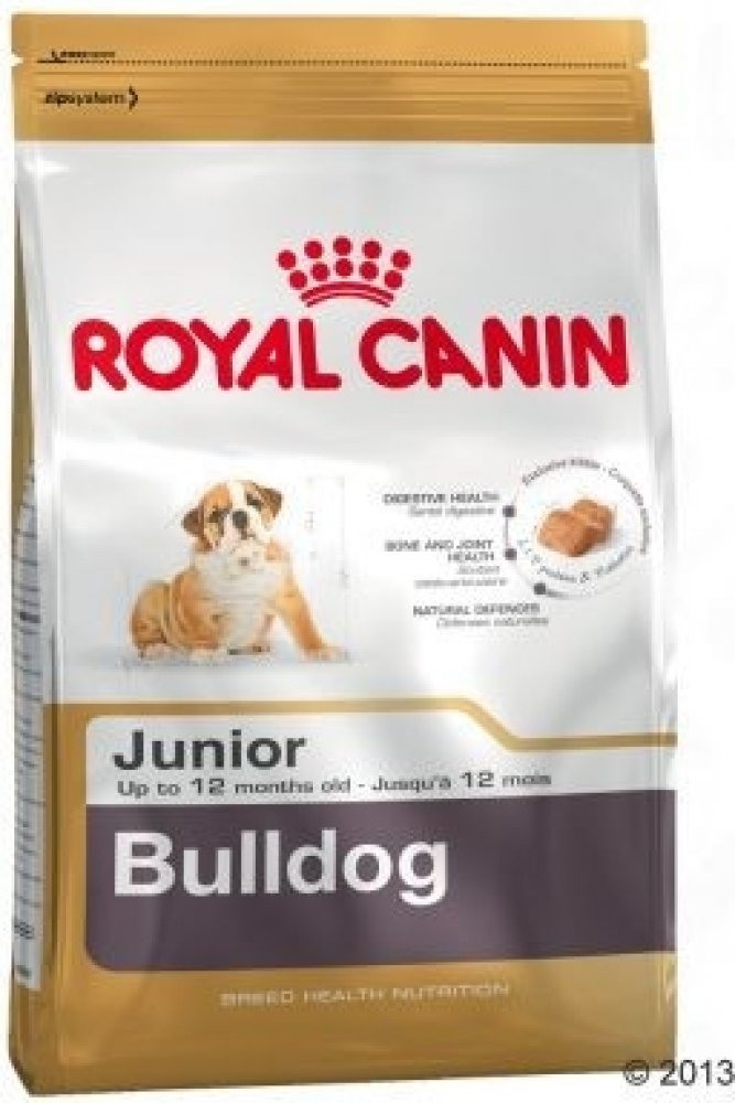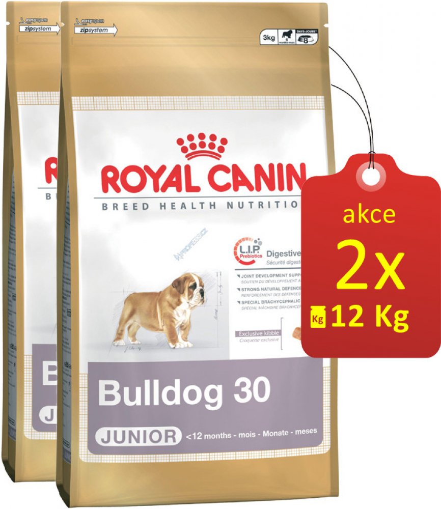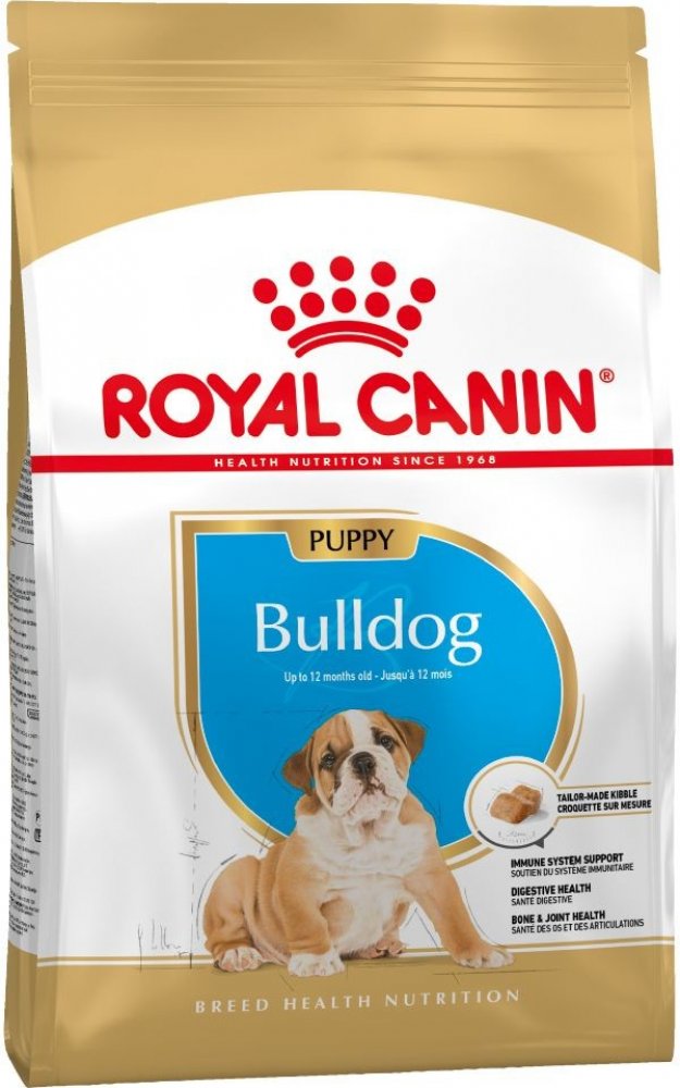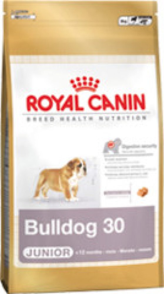 Mladí buldoci potřebují při svém růstu krmivo, které splní jejich speciální nutriční požadavky. U buldoků je nutné věnovat zvláštní pozornost jejich kloubům. Také je nutné podporovat a posilovat jejich imunitu. Plemeno buldok je klidné, vyrovnané, vhodné pro rodiny. Tito psi mají přímo zlaté srdce. Buldoci mají díky jejich speciálnímu tvaru lebky a podkusu (tzv. krátkolebkost) úzké dýchací cesty. Zvýšená námaha při dýchání se může projevit i na trávicí soustavě. Také příjem krmiva mají buldoci složitější. Proto je vhodné podávat krmivo, které má speciální tvar granulí a tím mu usnadnit příjem potravy. V záhybech kůže se zadržuje teplo a vlhkost, tak vznikají u buldoků problémy se srstí a kůží. Klouby buldoků potřebují ochranu, protože, díky jejich tělesné stavbě, jsou více namáhané. Kompletní krmivo Royal Canin Breed Bulldog 30 Junior je přizpůsobeno požadavkům mladých buldoků do 12 měsíců. Granule Royal Canin Breed Bulldog 30 Junior v krátkém přehledu:: Kloubní ochrana: krmivo obsahuje 24 % proteinů, tím přispívá ke štíhlému svalstvu, vysoký obsah L-Karnitinu, chondroitinu a glukosaminu, omega-3 mastných kyselin (EPA/DHA) přispívá k výživě kloubních chrupavek a pomáhá udržovat optimální hmotnost psa Pro zdravou kůži: obsah antioxidačního komplexu ze zinku, vitamínů a aminokyselin zlepšuje kvalitu kůže a srsti Optimální příjem krmiva a podpora zdravých zubů: ergonomický tvar granulí ulehčí jejich příjem a nutí buldoky k intenzivnějšímu kousání, přitom dochází k mechanickému čištění chrupu Vytvoření silného imunitního systému: k posílení imunity napomáhá speciální komplex antioxidantů Optimální trávení: zabránění nežádoucích procesů bakteriálních kvašení díky nízkému obsahu nestravitelných proteinů, přísun rostlinných vláken pro dobré trávení a obsahu FOS podporuje zdravou střevní mikroflóru Granule: