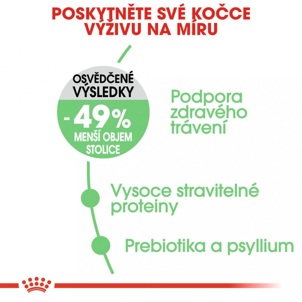 Studie prokázala, že granule Royal Canin Digestive Care nabývají efektivnosti již po 10 dnech výhradního krmení. Výsledkem bylo snížení tvorby stolice až o 49% v porovnání se standardním krmivem pro dospělé kočky. (Interní studie Royal Canin, 2014 - Porovnání se standardním krmivem pro kočky)