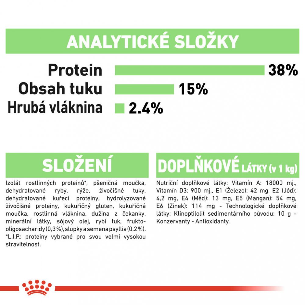 SLOŽENÍ: rostlinný bílkovinný izolát, pšeničná krmná moučka, rýže, sušené rybí maso, živočišný tuk, drůbeží bílkovina (sušená), živočišná bílkovina (hydrolyzovaná), kukuřičný lepek, kukuřičná krmná moučka, lignocelulóza, čekanková vlákna, minerální látky, sójový olej, rybí olej, fruktooligosacharidy (0,3%), psyllium (0,2%). Vitamín A (17.000 IE/kg), vitamín D3 (900 IE/kg), železo (41 mg/kg), jód (4,1 mg/kg), měď (12 mg/kg), mangan (53 mg/kg), zinek (159 mg/kg).