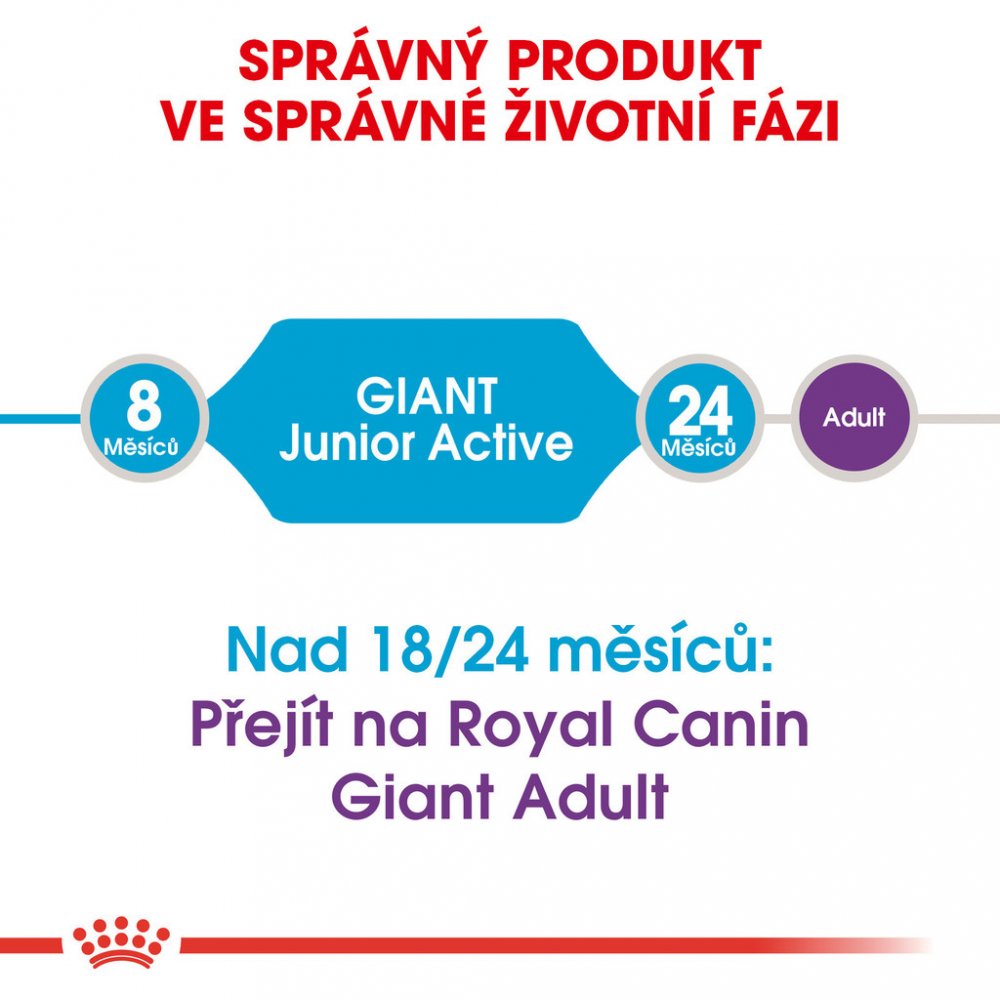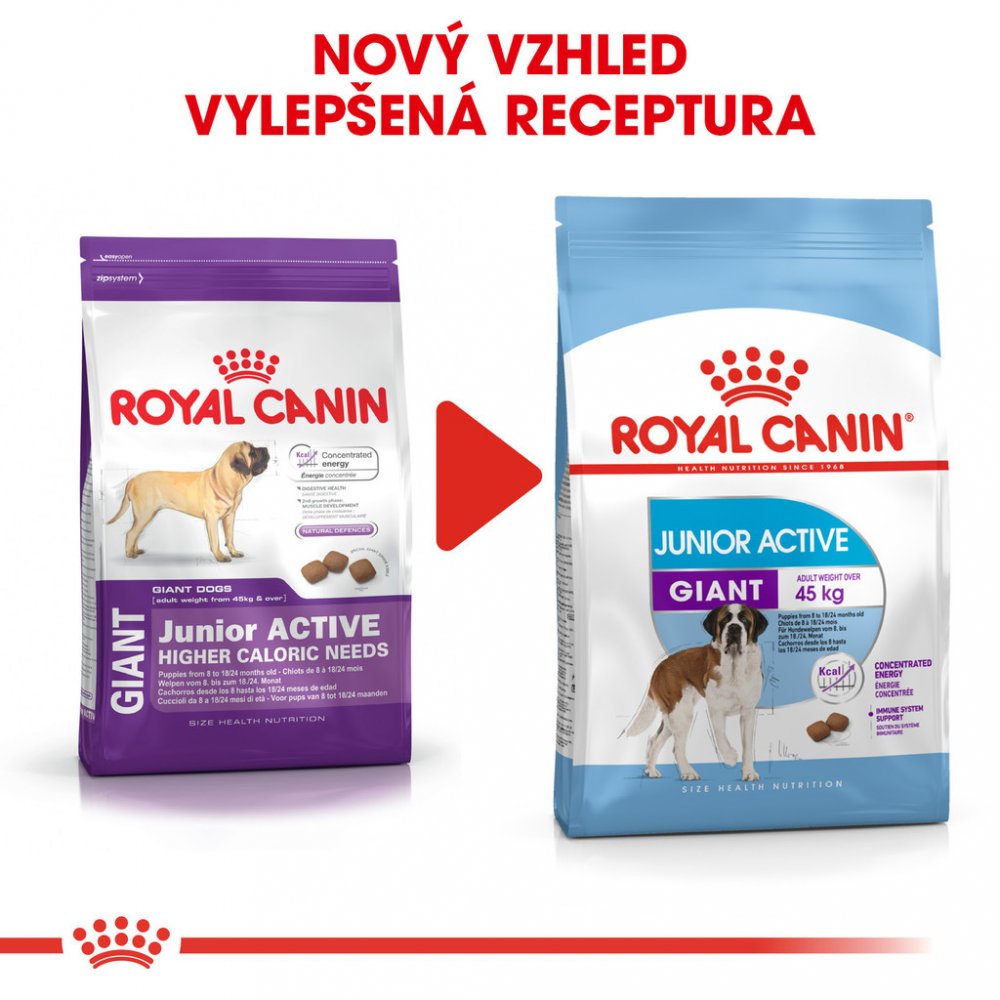 Granule Royal Canin Giant Junior je vhodné pro štěňata obřích plemen s vysokými energetickými potřebami od 8 do 18/24 měsíců, kteří v dospělosti dosáhnou hmotnosti nad 45 kg.