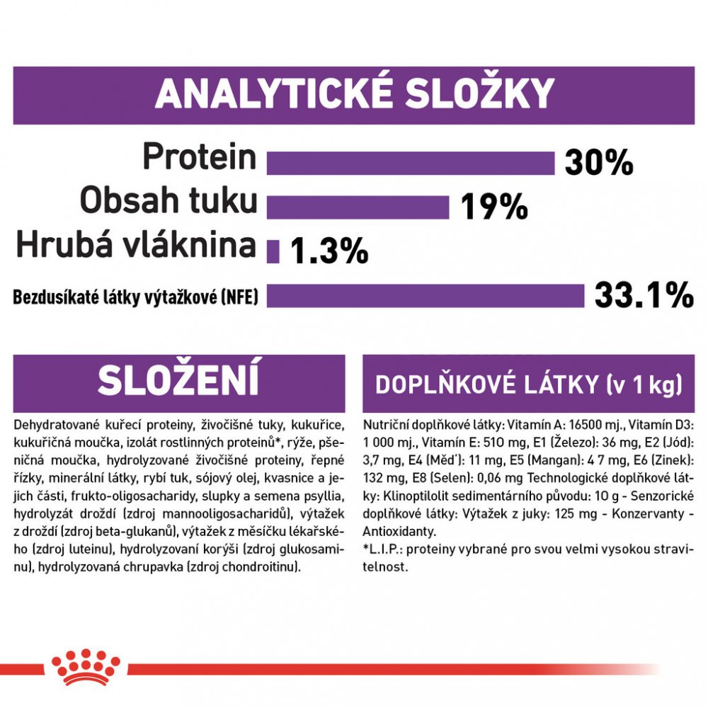Složení: Dehydratované kuřecí proteiny, rýže, kukuřice, živočišné tuky, izolát rostlinných proteinů*, hydrolyzované živočišné proteiny, řepné řízky, minerální látky, rybí tuk, sojový olej, kvasnice, slupky a semena Psyllia, frukto-oligosacharidy, hydrolyzát droždí (zdroj manno-oligosacharidů), hydrolyzovaní korýši (zdroj glukosaminu), výtažek z měsíčku lékařského (zdroj luteinu), hydrolyzovaná chrupavka (zdroj chondroitinu).