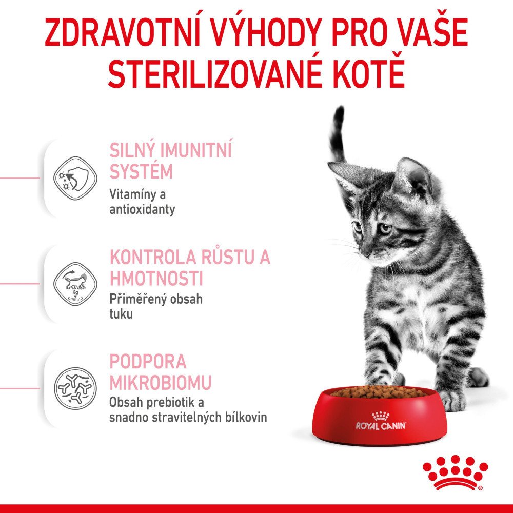 Toto krmivo je dobře tolerováno i citlivými žaludky, protože obsahuje vysoce stravitelné bílkoviny a prebiotika. Granule jsou také dostatečně měkké, aby se vašemu kotěti dobře žvýkaly. Navíc krmivo ROYAL CANIN® Kitten Sterilised pomáhá udržovat močové cesty vašeho kotěte zdravé. Nezapomínejte, že z tohoto důvodu musí mít vaše kočka vždy přístup k misce s čistou vodou. V těchto chutných a křupavých granulích se nachází drůbeží maso a rostlinná vláknina, které zaručují skvělou chutnost a optimální rovnováhu živin.