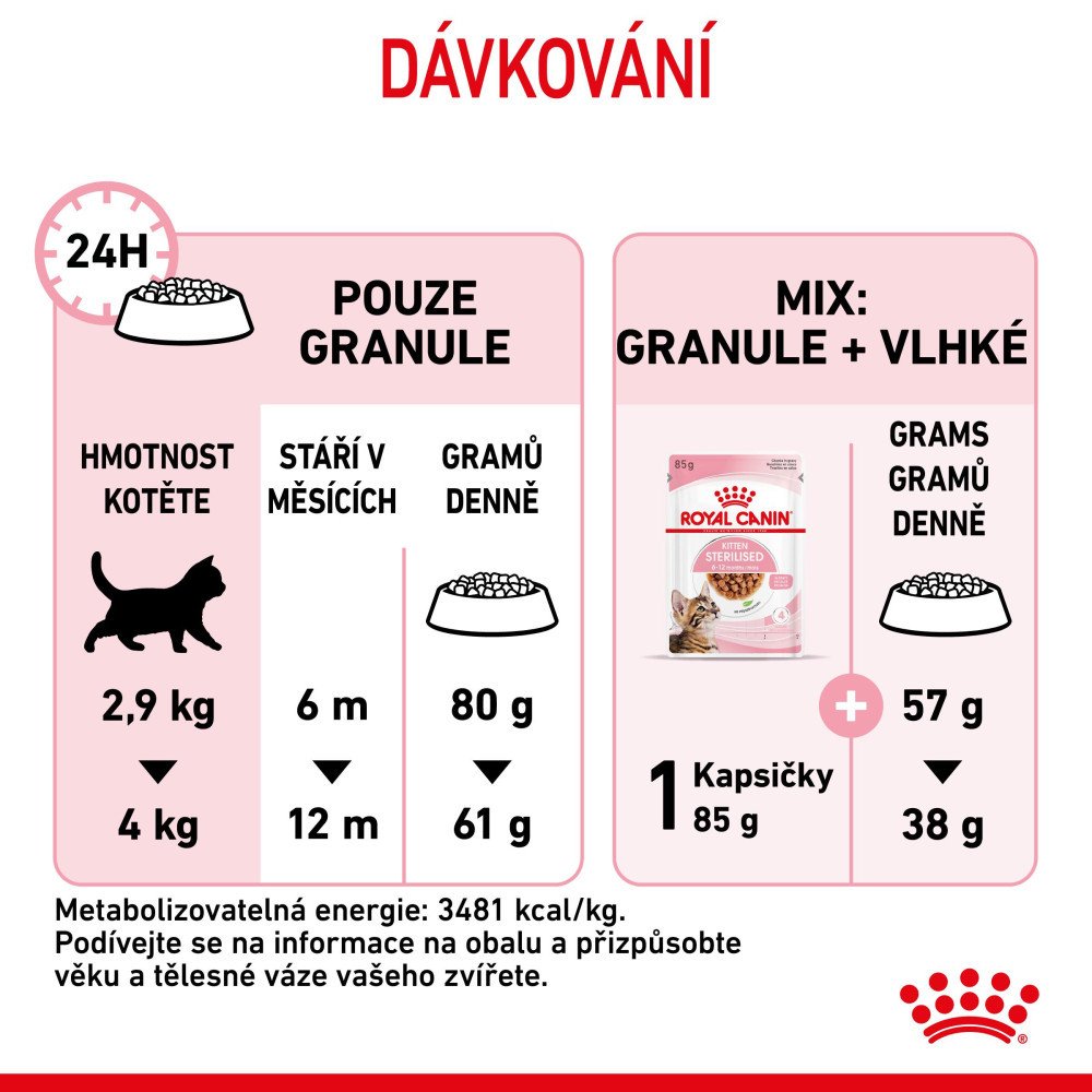 Aby mohlo uspokojit chutě co nejvíce koček, krmivo ROYAL CANIN® Kitten Sterilised je dostupné také ve vlhké formě jako kousky ve vynikající šťávě nebo šťavnatém želé. Pokud přemýšlíte nad kombinovaným krmením, jednoduše se řiďte našimi pokyny, aby vaše kočka dostávala to správné množství suchého i vlhkého krmiva.