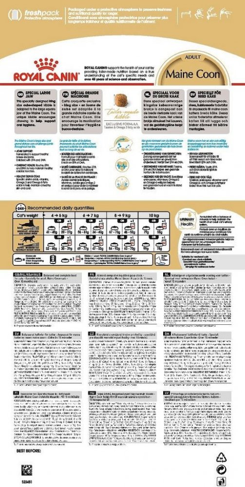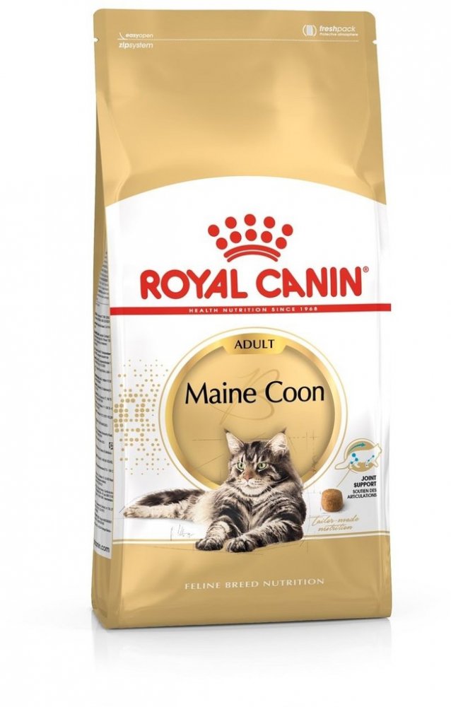 Maine Coon je v současnosti největší kočičí rasa na světě. Tyto kočky jsou "tišší obři", plní klidu a síly, jsou společenské, přítulné a vytvářejí si silný vzah k majiteli. Kočky rasy Maine Coon získaly velmi rychle příznivce v Americe a později také v Evropě. I když jsou tyto kočky skoro tak velké, jako malý rys, charakterem jsou klidné a tiché. Jejich robustní a velký vzrůst je dědictvím po předcích. Maine Coon jsou jedny z největších a nejimpozantnějších čistokrevných koček, často váží až přes 10 kg, tedy dvakrát tolik jako normální, domácí kočky. Při této velikosti a stavbě těla je důležité věnovat zvláštní pozornost podpoře kloubů kočky. Royal Canin Breed Maine Coon Adult proto obsahuje exkluzivní kombinaci chondroitin sulfátu, glukosaminu a rybího oleje, který je bohatý na EPA a DHA. Tímto způsobem lze podpořit silné kosti i klouby. EPA a DHA, stejně jako L-karnitin a antioxidanty mohou rovněž přispívat ke zdravé funkci srdce. Pozoruhodná je také nádherná srst mainských mývalích koček. Hustá, polodlouhá srst s jemnou, měkkou podsadou vyžaduje zvláštní péči. Krmivo Royal Canin Breed Maine Coon Adult dodává vaší kočce vybrané aminokyseliny, vitamíny a omega-3 a omega-6 mastné kyseliny. Tyto živiny mohou přispět k lesklé srsti a zdravé kůži. Royal Canin Maine Coon krmivo pro kočky je speciální krmivo, vyvinuté pro potřeby koček rasy Maine Coon : Velké granule: Kočky rasy Maine Coon mají silnou dolní čelist a proto mohou poměrně rychle sežrat svou porci krmiva. Velikost, forma a textura granulí je proto rozhodující pro rychlost, s jakou kočky krmivo rozkoušou a sežerou, a větší granule tím pádem příznivě ovlivňují i jejich chrup. Kontrola pohyblivosti: Glukosaminchlorid a chondroitin sulfát působí proti opotřebení chrupavek a podporují pohyblivost kloubů Beauty Shine Complex: Esenciální nenasycené mastné kyseliny z brutnákového oleje s kombinací vitamínů mají pozitivní vliv na zdraví kůže, stejně jako na hebkou a lesklou srst Granule velké velikosti: Vhodné mokré krmivo Royal Canin najdete zde: Royal Canin Breed Maine Coon