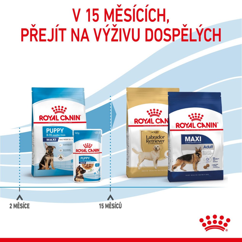 Krmivo Royal Canin Maxi Junior podporuje trávicí procesy, vyváženou střevní mikroflóru, odolnost kloubů a kostí, ale i správnou konzistenci psí stolice. Dále splňuje přísné nároky na obsah energie. Hodnota energie je u velkých plemen velmi hlídaná z důvodu dlouhodobého růstu. Speciální krmivo Maxi Puppy pro štěňata do 15 měsíců v sobě ukrývá bohaté složení plné živin a vitamínů. Granule jsou připravené na míru velkým plemenům s hmotností až 44 kg. Váš “malý velký” parťák se tak může těšit na pořádnou dávku kvalitních bílkovin pro nabírání svalové hmoty i unikátní komplex antioxidantů s vitamínem E pro posílení přirozené obranyschopnosti. Krmivo obsahuje také prebiotika podporující trávení a udržující střevní mikroflóru v rovnováze. Nezapomněli jsme ani na vybraná přírodní aromata, díky kterým si pochutná i ten největší jedlík.