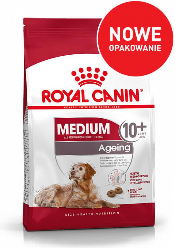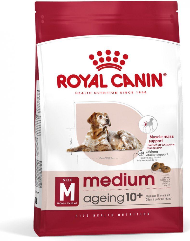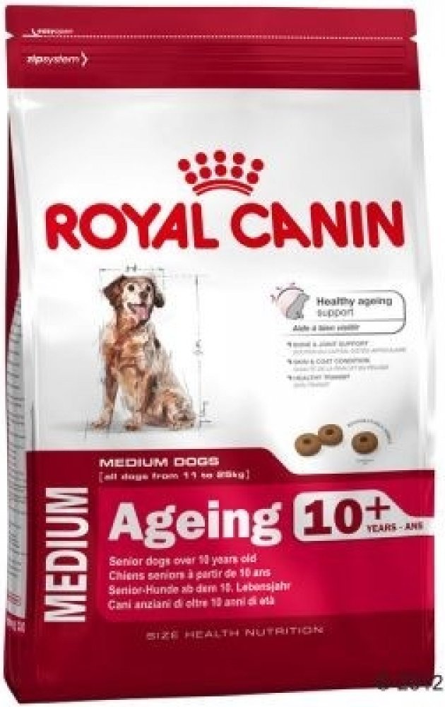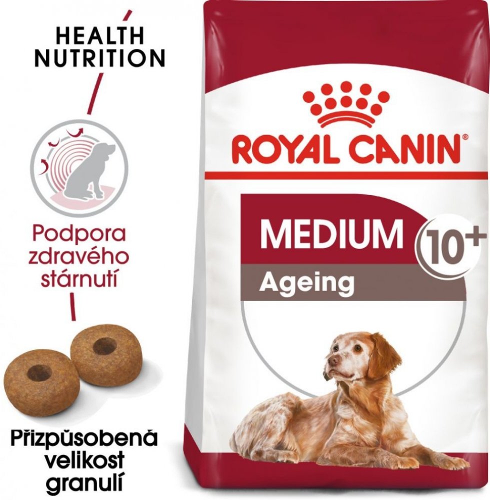 Royal Canin Medium Ageing 10+ je kompletním krmivem pro středně velké dospělé psy- seniory od stáří 10 let. Speciálně vybrané živiny podporují kondici Vašeho psa v období stáří. Obsahuje EPA/DHA a speciální antioxidační komplex, který pomáhá chránit buňky před volnými radikály. Středně velcí psi jsou často robustnější a čilejší než ostatní psi. Jejich aktivity, životní styl jsou často velice různorodé- od klidného rodinného psa po psa s vysokou zátěží. Rodinný pes tíhne spíše k nadváze a potřebuje proto řízený příjem živin. Naopak pes poskytující výkony (lov, agility, atd.) má mnohem vyšší potřebu energie. Pohyb ve vodě, prozkoumávání keřů atd. vyžaduje dobrou ochranu kůže a srsti. První příznaky stárnutí mohou být např. nechuť pohybovat se, ztrácející se čich a citlivé trávení. Imunitní systém se se stářím zhoršuje a zvyšuje se riziko onemocnění. Výměna srsti se zpomaluje a srst ztrácí lesk. Dochází ke zvýšení rizika tvorby zubního kamene a následků s tím spojených. Royal Canin Medium Ageing 10+ je krmivem vyvinutým speciálně pro specifické potřeby psů středně velkých ras (11 - 25 kg) od 10 let: Ochrana kostí a kloubů: Přispívá k ochraně obzvláště namáhaných kostí a kloubů Zdravá kůže a krásná srst: Speciální živiny přispívají k zářící srsti a zdravé kůži Podpora zdravého trávení: Přiměřené množství vlákniny přispívá ke zdravému trávení. Bílkoviny v krmivu jsou velmi dobře stravitelné a ovlivňují tak pozitivně konzistenci stolice.