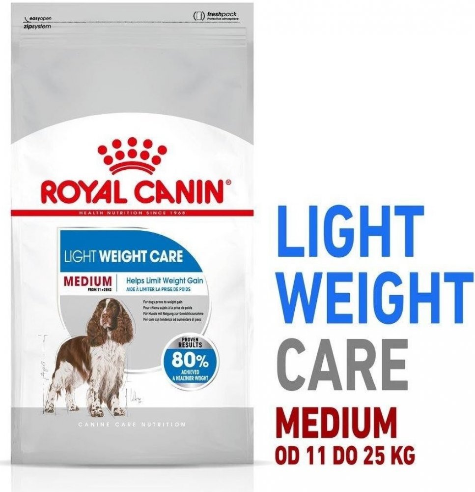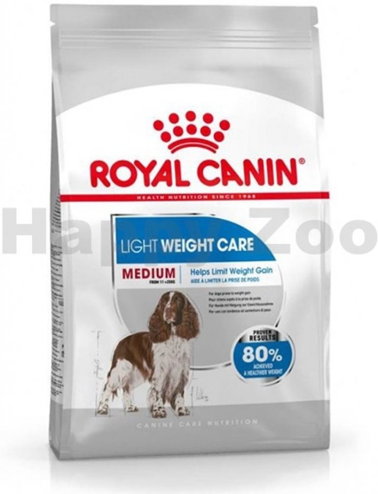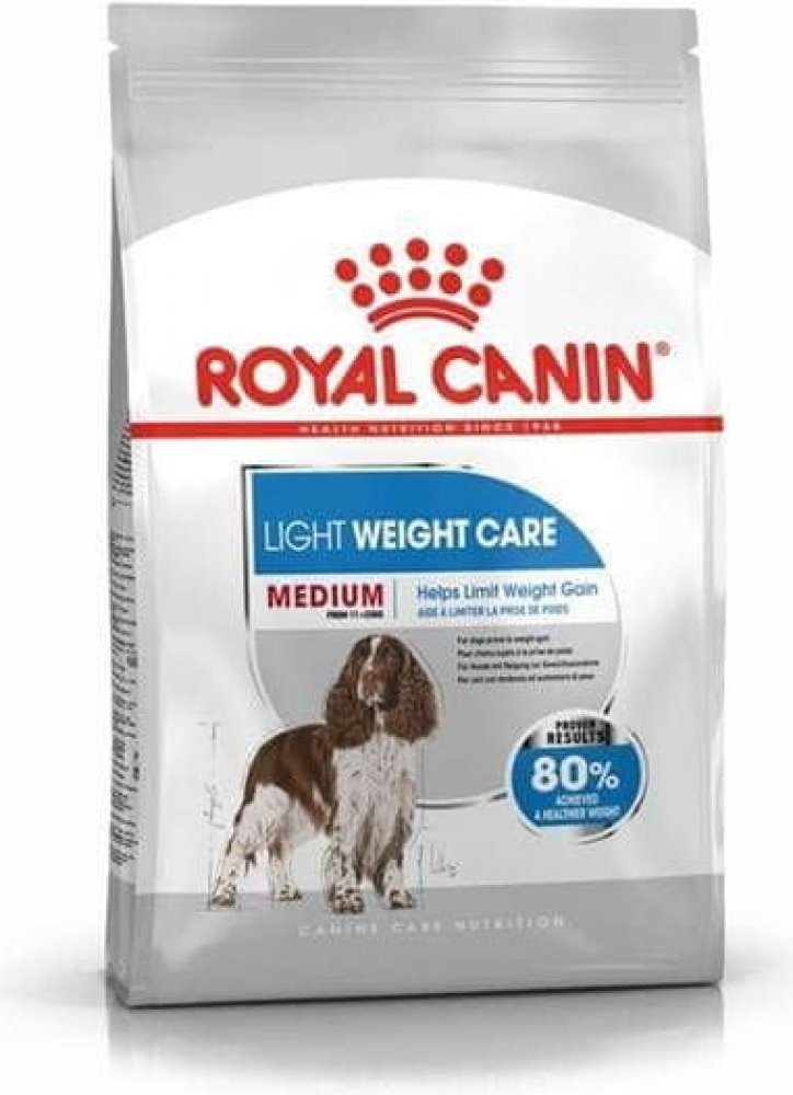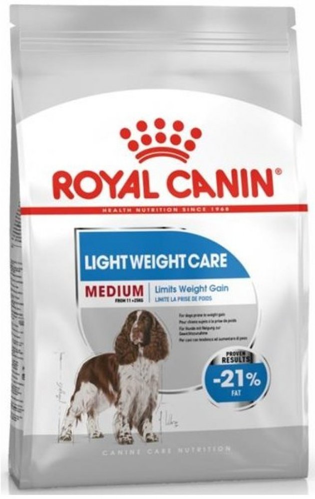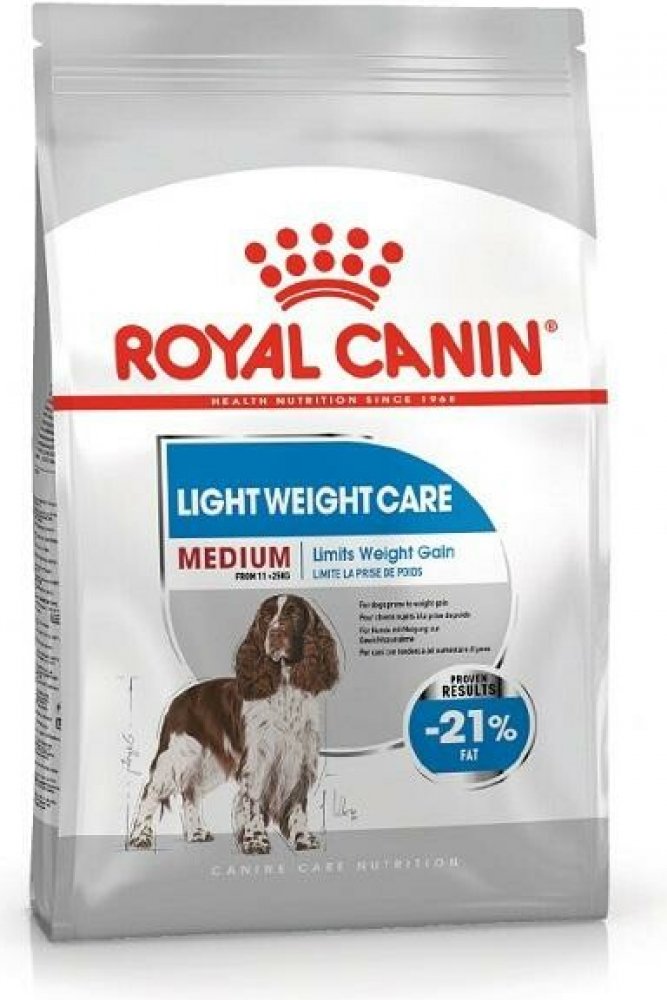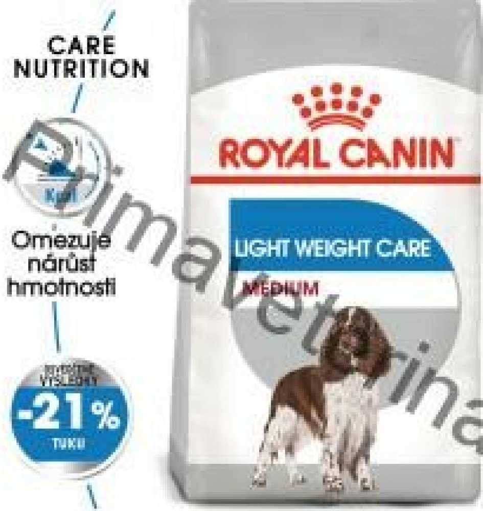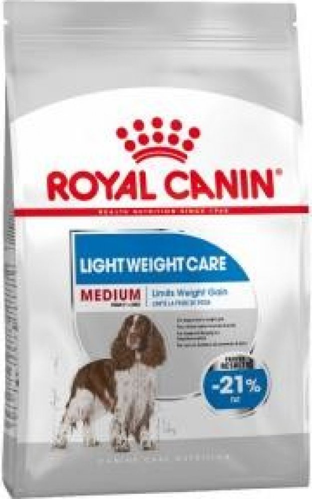 Royal Canin Medium Light Weight Care je kmpletní krmivo pro psy středně velkých ras se sklony k nadváze, s vysokým obsahem bílkovin (27 %) a sníženým obsahem tuku (11 %), s omega-3 mastnými kyselinami, L-karnitinem a aktioxidačním komplexem.