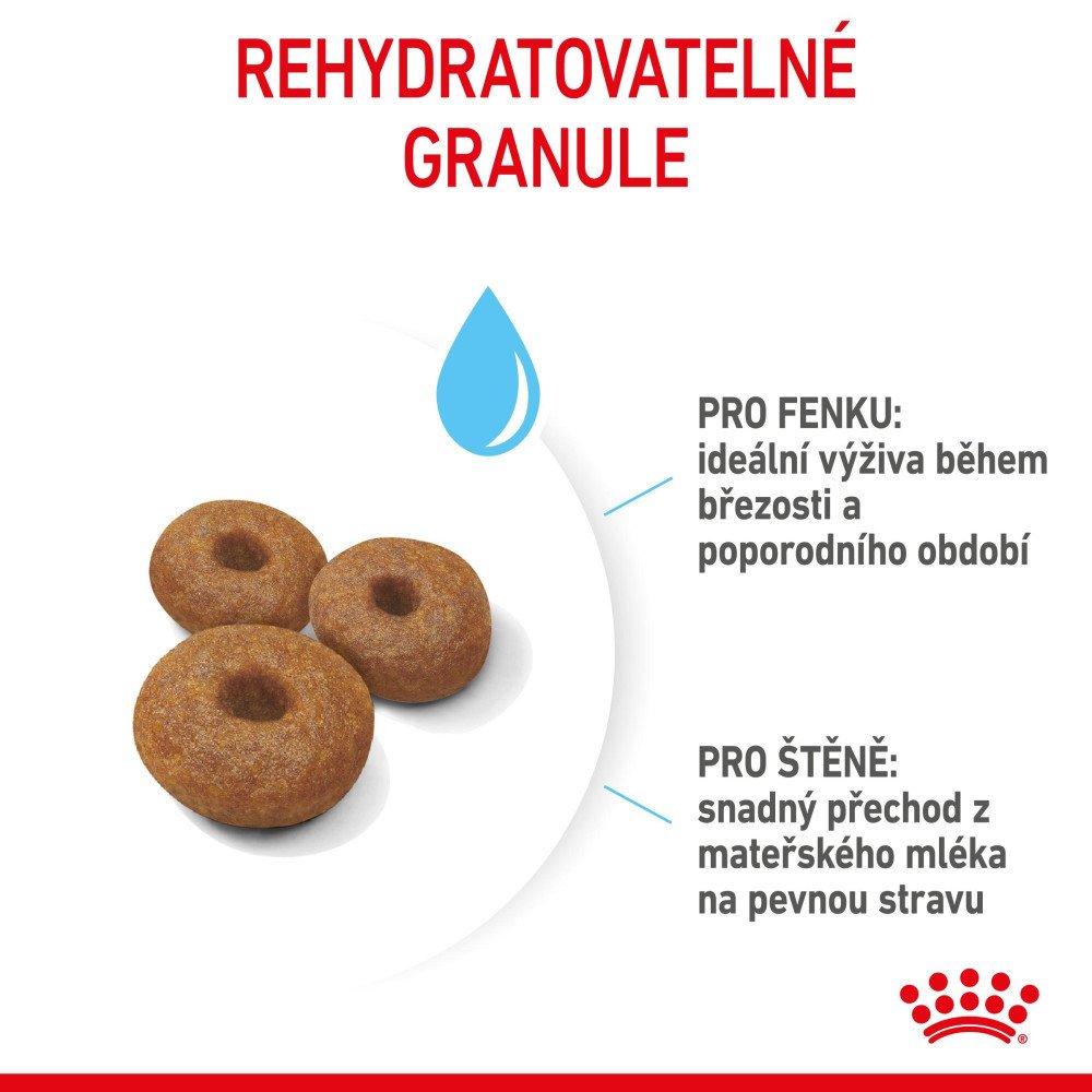Granule snadno rehydratují, přičemž získávají kašovitou konzistenci, která feně a odstaveným štěňatům usnadňuje jejich příjem.