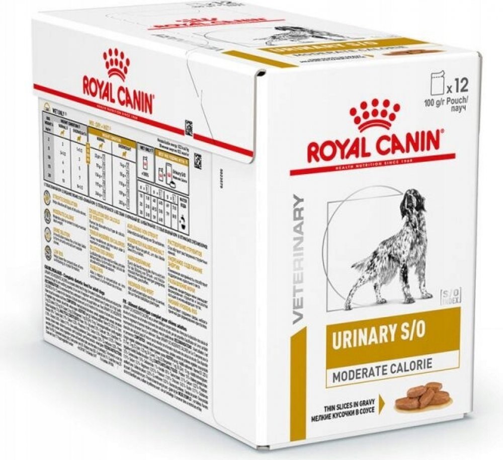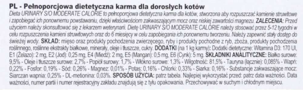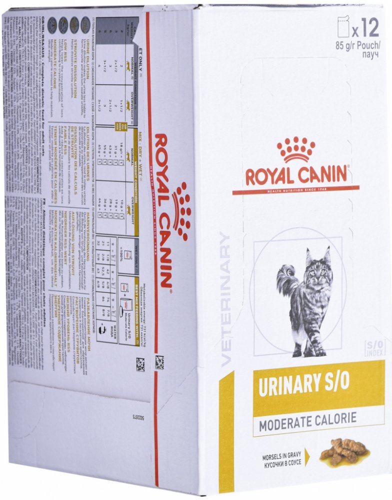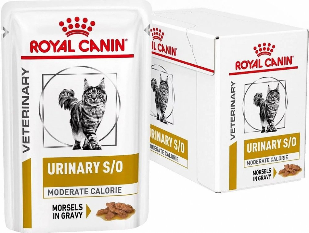 Speciální veterinární dieta v podobě kapsičky pro dospělé kočky se sklony k nadváze až obezitě trpící onemocněním močových cest. Onemocnění močových orgánů může u koček vést až ke vzniku močových kamenů včetně struvitových či kalciumoxalátových nebo k felinní idiopatické cystitidě (FIC). Veterinární dieta v podobě kapsičky s vlhkým krmivem pro správnou funkci močového měchýře, močoé trubice a ledvin přizpůsobená kočkám se sklony k nadváze až obezitě je navržena tak, aby pomohla rozpouštění močových kamenů, tvorbě nenasycené moči a zabránila recidivě.