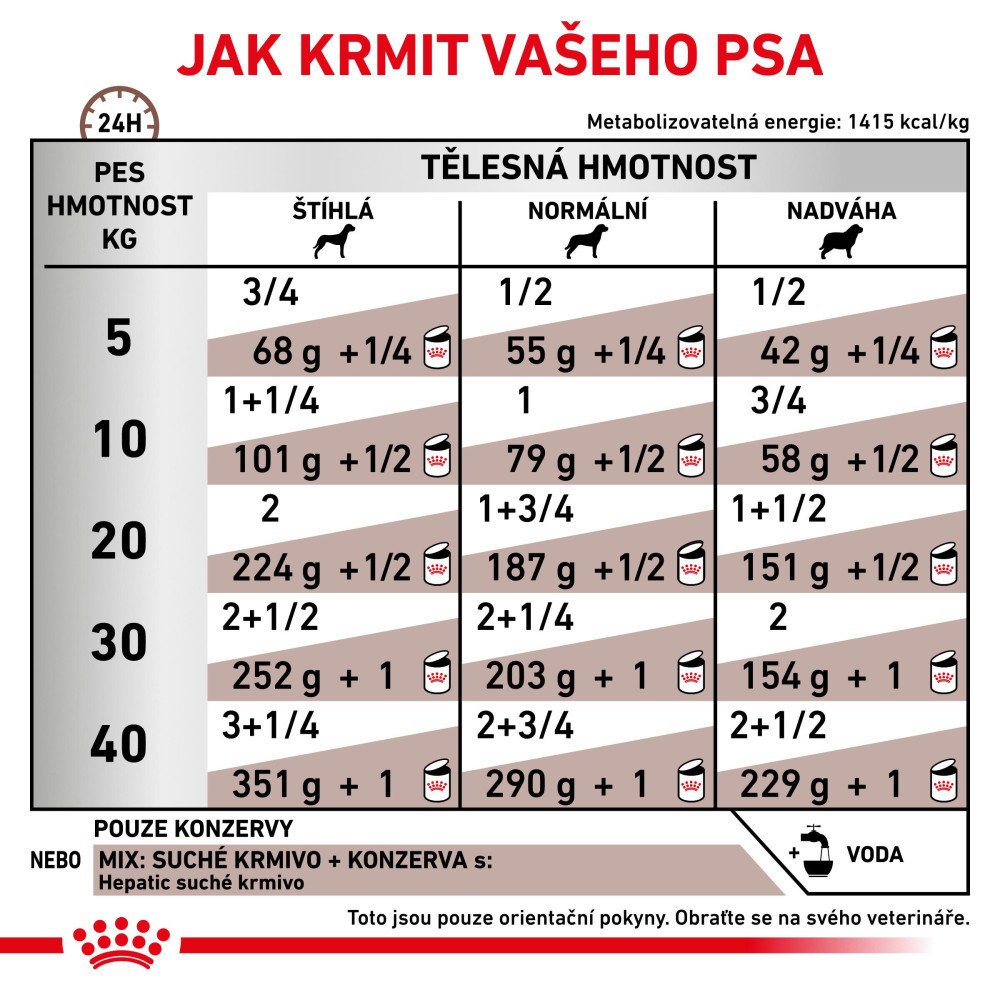 Podávejte samostatně nebo v kombinaci s granulemi Royal Canin Hepatic (potom snižte dávku).