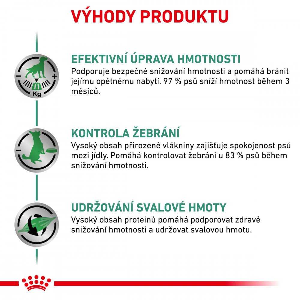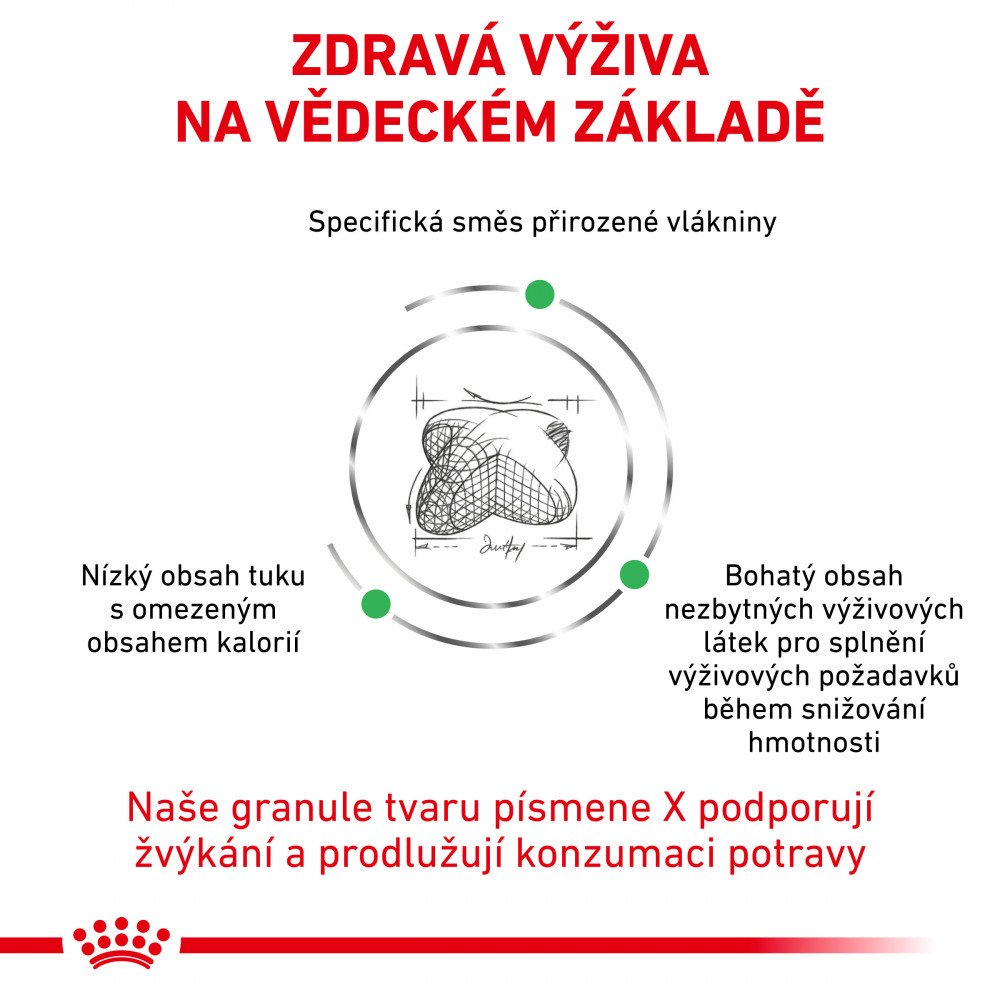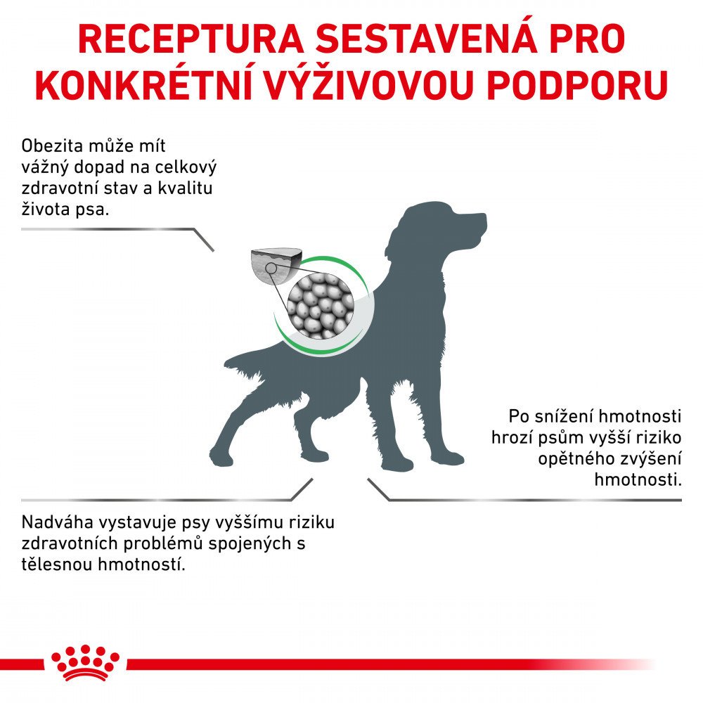 Nadbytečný příjem potravy a málo pohybu vede k problémům s nadváhou až obezitou. S nízkoenergetickou, dokonale vybalancovanou veterinární dietou však pes dosáhne optimální tělesné hmotnosti a udrží se v dobré kondici.
