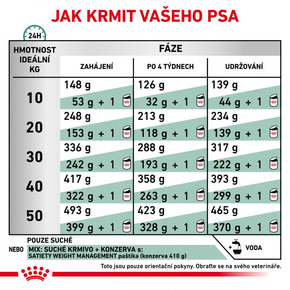 Nadbytečný příjem potravy a málo pohybu vede k problémům s nadváhou až obezitou. S nízkoenergetickou, dokonale vybalancovanou veterinární dietou však pes dosáhne optimální tělesné hmotnosti a udrží se v dobré kondici.