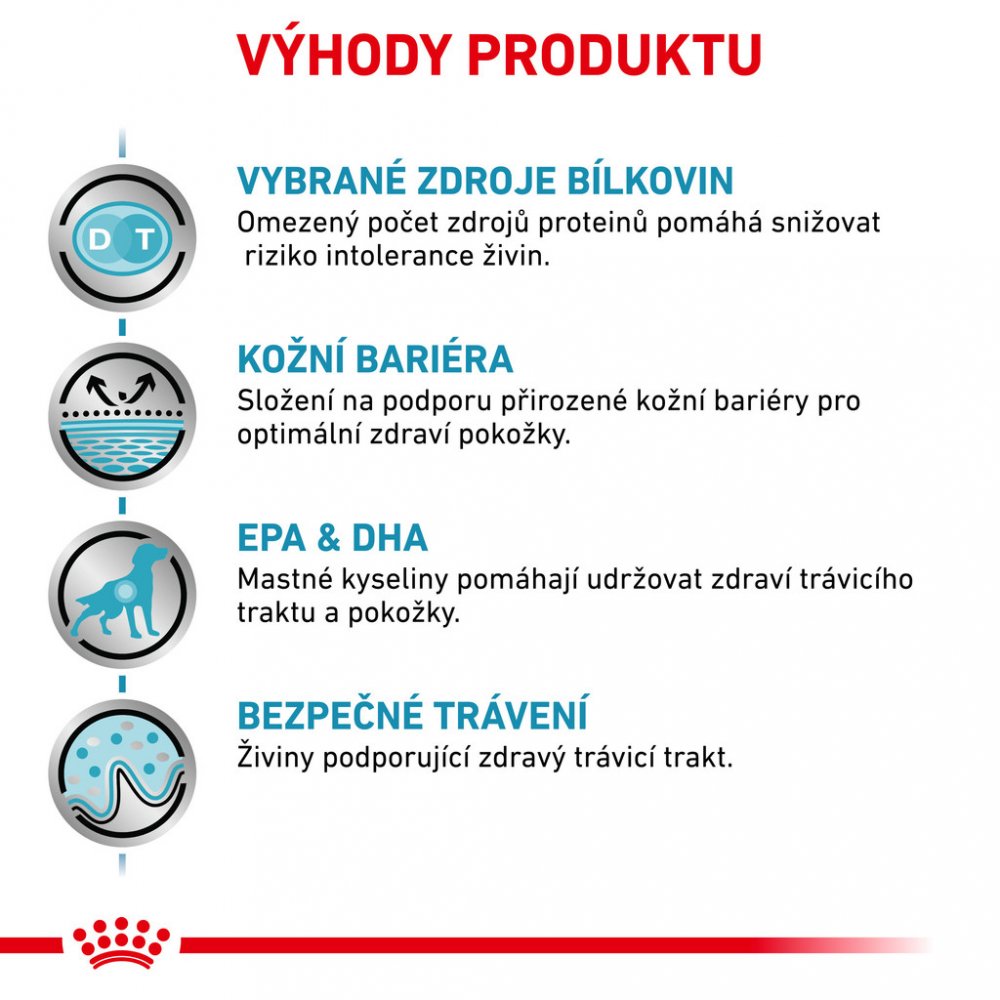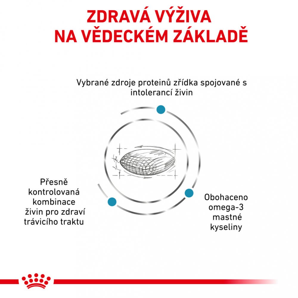 Speciální veterinární dieta pro dospělé psy trpící potravinovými intolerancemi určitých komponentů a živin.