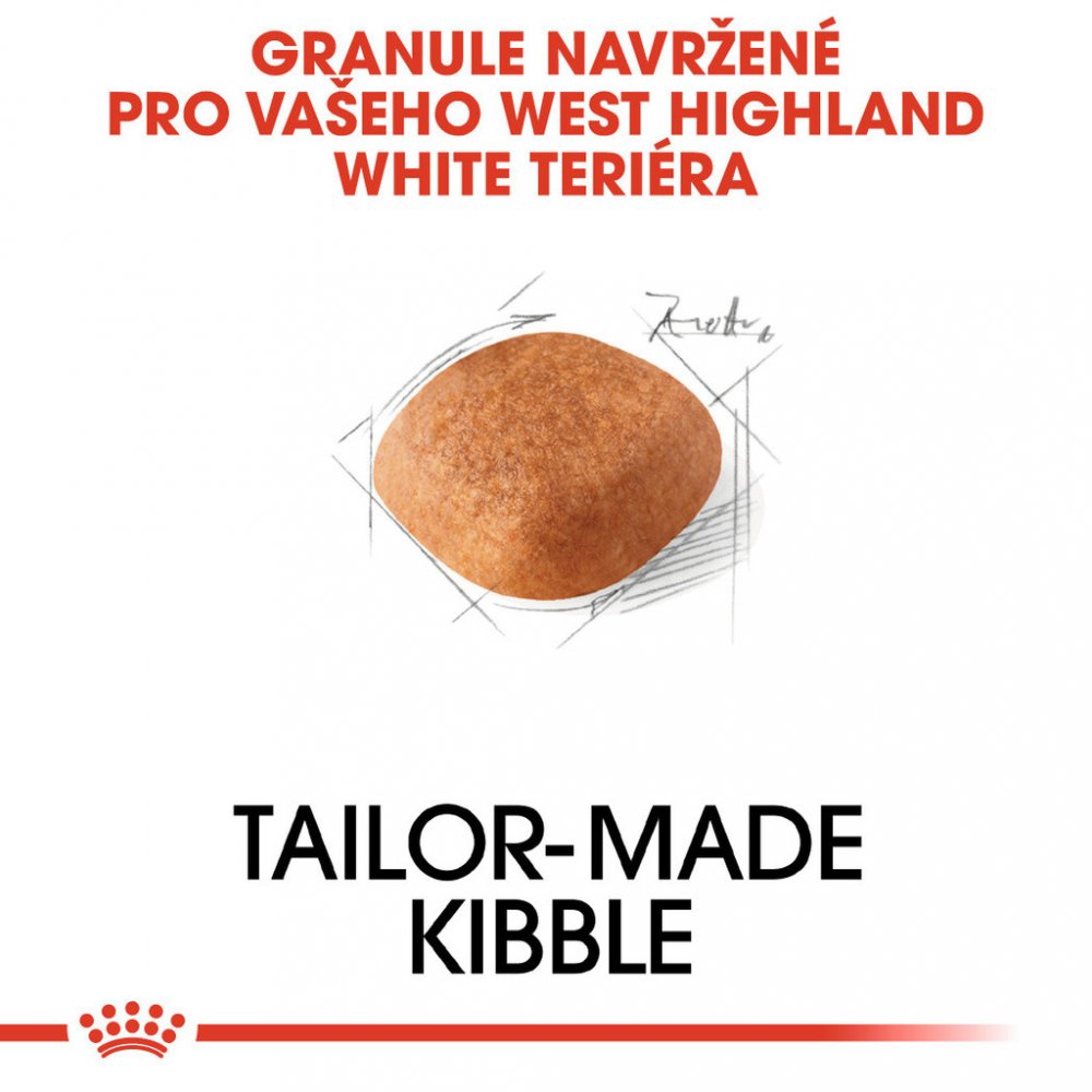 West Highland White teriér má hrubou srst a choulostivou pokožku. Na míru vytvořené krmivo West Highland White Terrier 21 zahrnuje přísun specifických aminokyselin pro růst srsti, a také specifické mastné kyseliny pocházející z brutnákového oleje a lněného semínka pro lesklou srst a zdravou pokožku. West Highland White Terrier 21 má dále za cíl dosáhnout u westíka zářivé bílé srsti.