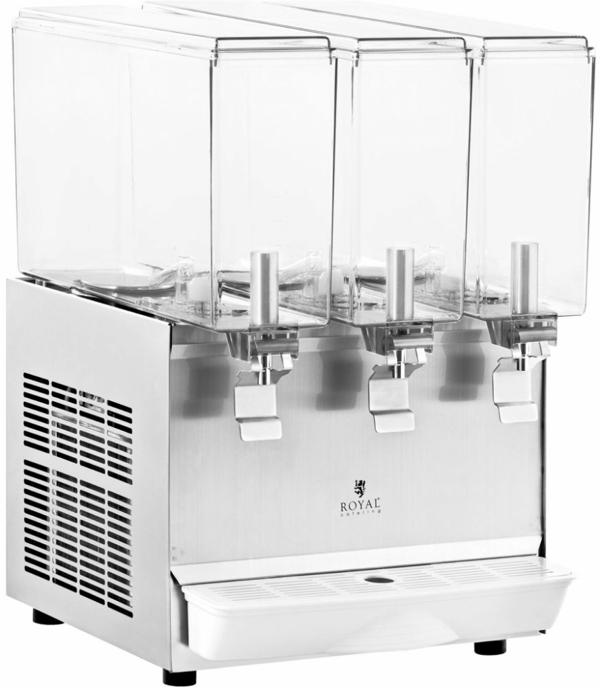S dávkovačem nápojů RC-JDD03 značky Royal Catering bude podávání studených nápojů v horkých dnech hračkou – ať už jde o smoothies, džusy nebo alkoholické nápoje. Vysoce kvalitní, průhledný dávkovač šťávy umožní vyniknout vašim studeným nápojům a je speciálně vyroben pro potřeby cateringu. Díky své robustní konstrukci je zařízení ideální pro použití ve snack barech, bufetech, plážových barech nebo na festivalech. Jeho uživatelská přívětivost a skutečnost, že je vyroben z trvanlivých a odolných materiálů, dotváří celkový dojem a také činí dávkovač nápojů vhodným pro použití v domácnosti. Dávkovač šťávy je vybaven 3 průhlednými nádobami, které pojmou 3 x 10 litrů tekutiny. Nápoje vybavené nekapající kohoutky lze snadno plnit a míchat dohromady. Vzhledem k velké kapacitě je dávkovač nápojů ideální pro velké akce – například výstaviště, pouliční slavnosti nebo festivaly jídla. Dávkovač nápojů je poháněn spolehlivým 320wattovým motorem, který je obzvláště energeticky úsporný a nákladově efektivní. Větrací otvory na zařízení zabraňují přehřátí motoru a přispívají k dlouhé životnosti výrobku. Nádoby jsou vyrobeny z průhledného plastu (polykarbonátu) a jsou odolné vůči extrémním teplotám. Disponují vysokou odolností proti nárazu, a proto jsou obzvláště tvarově stálé a trvanlivé. Lehká, odolná víka chrání obsah před prachem a nečistotami. Vyjímatelná a snadno čistitelná odkapávací miska zachycuje přebytečné tekutiny a zajišťuje čisté pracoviště.