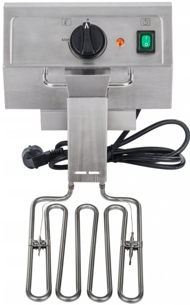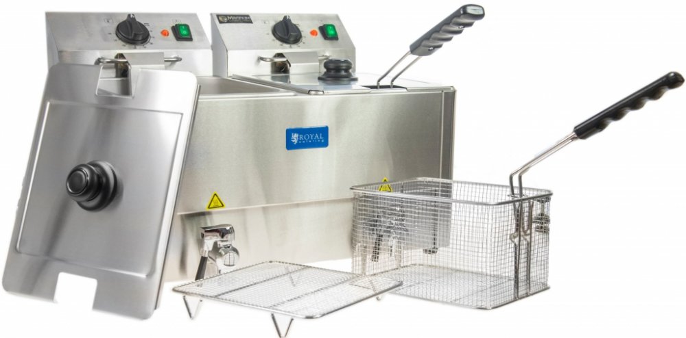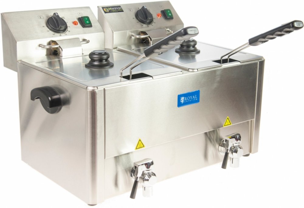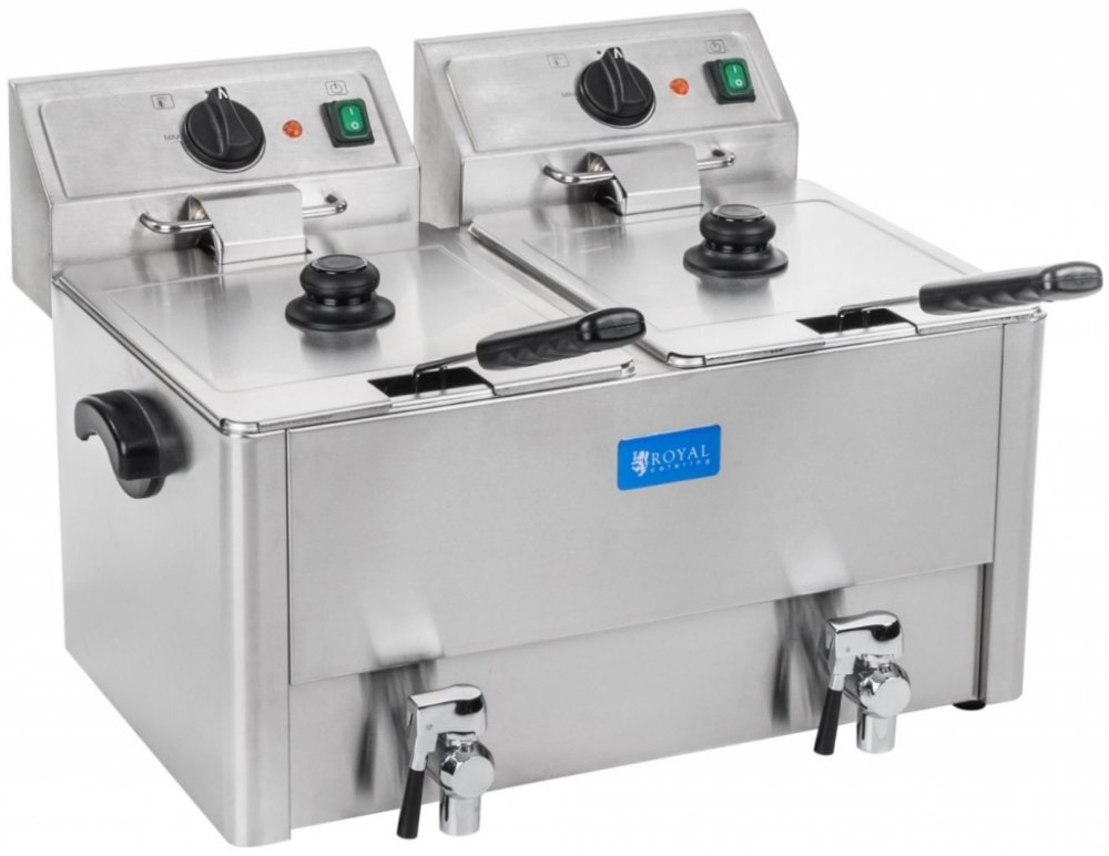 Dvojitá fritéza 2 x 13 litrů RCEF 13D-EGO od společnosti Royal Catering UPOZORNĚNÍ: vemte prosím na vědomí upozornění výrobce k bezpečnosti produktu. Dvojitá Fritéza 2 x 13 litrů RCEF 13D-EGO od společnosti Royal Catering byla koncipována pro profesionální využití. Fritéza je vyrobena z vysoce kvalitní ušlechtilé oceli, díky čemuž je odolná vůči korozi a lehce se čistí. Ve fritéze RCEF 13E-EGO jsou vestavěny vysoce moderní termostaty německé společnosti E. G. O. Termostaty firmy E. G. O. patří k nejmodernějším a nejjemnějším termostatům na trhu. Výkonný topný element fritézy pracuje s 3250 W. Termostatem nastavená teplota zaručuje spolehlivost fritézy díky plně automatické kontrole stálosti teploty. Další předností je profesionální výpustný kohout s filtrem. Dodatkově bylo dbáno na to, aby byly nádržky zaoblené. To mnohanásobně ulehčí čištění. Stabilita je zaručena krajně protiskluzovými gumovými nožičkami. Aby bylo zabráněno spalování materiálu, který padá z fritovacího koše, disponuje elektrická fritéza speciálními studenými zónami na svém dně. Pro profesionální provoz E.G.O. termostat 2 x 3250 W výkon Prudké ohřívání Kapacita 2 x 13 l Celkový objem 2 x 13 l / max 2x 8 l oleje Chladicí zóny 100 % ušlechtilá ocel Jednoduchá obsluha a čištění Vypouštěcí kohout