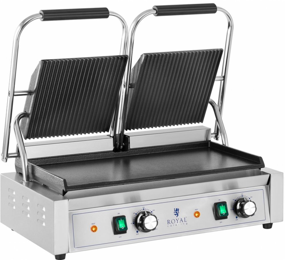 Efektivní grilování s dvojitým kontaktním grilem o výkonu 3 600 W Profesionální dvojitý kontaktní gril je určen nejen pro hotelové restaurace, kavárny, rychlá občerstvení a cateringové společnosti, ale také pro soukromé použití. Gril je neuvěřitelně flexibilní a je ideální pro přípravu masa, zeleniny, sendvičů nebo panini. výkon – rychlý ohřev díky výkonu 3 600 W univerzálnost – všestranné použití díky vroubkované a hladké grilovací ploše snadná údržba – ušlechtilá ocel, litina a vyjímatelná nádoba na tuk pro jednoduché čištení spusta prostoru – grilovací desky poskytují velkorysý prostor (Horní desky: 21 x 21 cm, spodní deska: 48 x 23 cm) efektivita – díky grilování současně na obou stranách