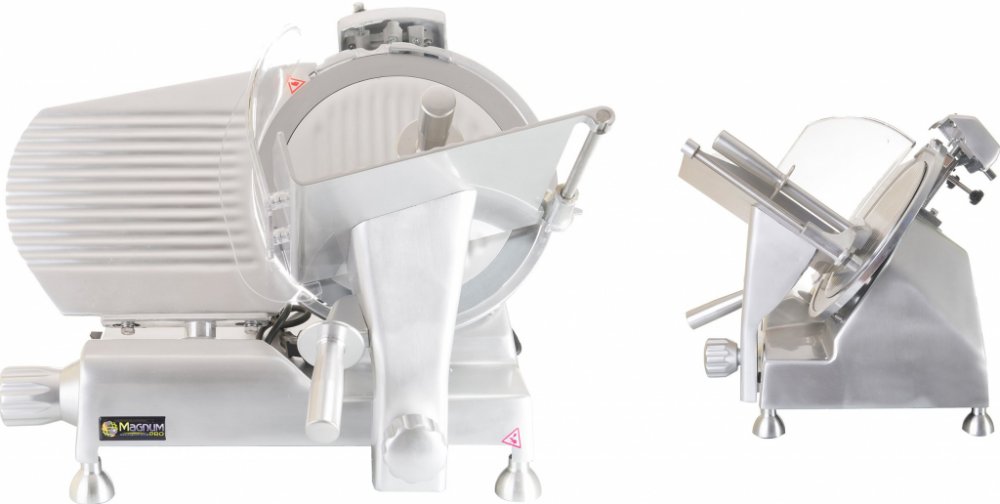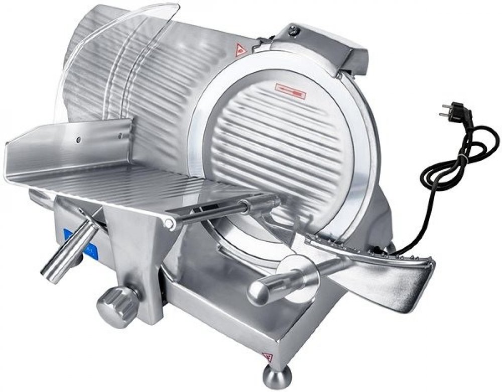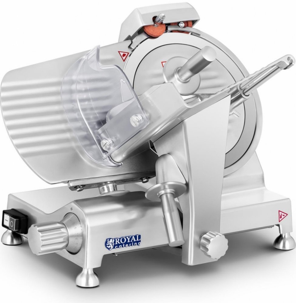 Royal Catering, specializovaný výrobce gastronomického vybavení, přináší nářezový stroj extra třídy RCAM-250EXPERT. Kráječ je vyroben z kvalitního eloxovaného hliníku, takže je účinně chráněn proti korozi, snadno se čistí a splňuje mezinárodní hygienické normy. Nůž nářezového stroje má průměr 250 mm, a proto se skvěle hodí pro krájení všech druhů uzenin, masa i sýrů. Jeho průměr je ideální na odborné a precizní krájení obvyklého zboží. Jedná se o tvrdě chromovaný speciální nůž s dutým výbrusem a hladkým břitem. Nářezový stroj je poháněn silným motorem o výkonu 180 W. Tato vysoká síla je dokonale přenášena promyšleným mechanismem a dochází jen k zanedbatelné ztrátě. To jednak zajišťuje velmi efektivní práci a jednak umožňuje snadno řezat i tvrdý sýr jako máslo. Za využití plné síly tak budete mít nižší provozní náklady. Vyzvednou je třeba především pouzdro z kvalitního leštěného a eloxovaného hliníku, což je materiál, který je obzvláště vhodný pro hygienickou práci s potravinami. Eloxovaný povrch hliníku a rychlá demontáž součástí zaručují snadné a ryché čištění. Nářezový stroj má tloušťku řezu plynule nastavitelnou mezi 0 a 12 mm. abyste mohli zákazníkům nabízet jak teboučké plátky šunky, tak tak silnější kolečka salámu či sýra. Přístroj slouží ke krájení produktů o maximální šířce 18 cm a maximální výšce 13 cm. Při vývoji produktu byla kladen velký důraz na nenamáhavou práci. Speciální úhel zaručuje optimální tlak na řezaný materiál za minimálního úsilí. Kombinace kuličkového a kluzného ložiska umožňuje jednoduché, tiché a nenamáhavé používání přístroje. Ložiska navíc vynikají dlouhou životností. Další výhodou tohoto modelu je zabudovaný poloautomatický brusič nože. Jakmile začne být nůž tupý, můžete jej nabrousit velice snadno a rychle. Nejenže ušetříte čas a peníze, ale nervy, neboť se vyhnete nepříjemné výměně nože. Nůž je vyroben ze speciální oceli pro nože, což se odráží v kvalitě řezů a trvanlivosti nože. Kromě toho má nářezový stroj ochranný kryt nože. Nůž je zakryt na řezných hranách pro zvýšení bezpečnosti a snížení rizika nehod. Nůž je vyroben ze speciální oceli pro nože, což se odráží v kvalitě řezů a trvanlivosti nože. Kromě toho má nářezový stroj ochranný kryt nože. Nůž je zakryt na řezných hranách pro zvýšení bezpečnosti a snížení rizika nehod. Rukojeti stroje jsou vyrobeny z hliníku, který umožňuje nenamáhavou práci. Hliník je lehký materiál, díky němuž je práce s elektrickým kráječem pohodlnější. Robustní, kompaktní konstrukce a čtyři protiskluzové gumové nožičky zajišťují bezpečnost a stabilitu. Spínač pro zapnutí a vypnutí přístroje se nachází na boku. Je umístěn tak, abyste na něj vždy rychle a snadno dosáhli – především v nouzových situacích.